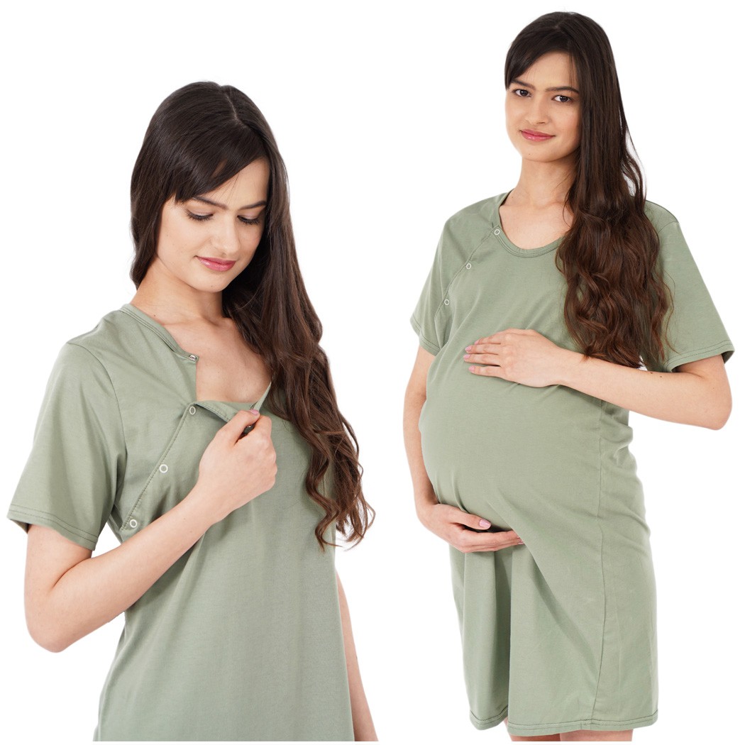 Zielona koszula nocna ciążowa z krótkim rękawem wykonana z miękkiego i przyjemnego w dotyku materiału, który po wielokrotnym praniu pozostaje w niezmienionym stanie. Zaprojektowana w bardzo wygodnym fasonie - delikatnie okrywa brzuszek w ciąży. Idealna w okresie karmienia. Piżamka ta posiada specjalnie zaprojektowany system, który ułatwia karmienie, a wycięcia z przodu do karmienia zapinane są na napki.