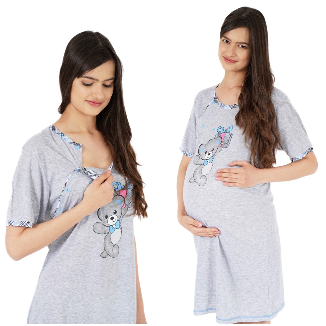 Koszula ciążowa oraz do karmienia w kolorze szarym z misiem - niebieskie dodatki