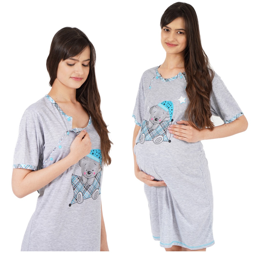 Szara KOSZULA NOCNA CIĄŻOWA I DO KARMIENIA MIŚ Z PREZENTEM niebieski