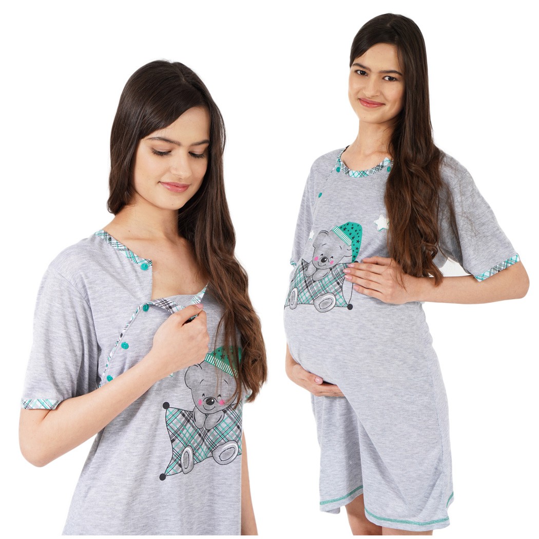 Koszula ciążowa oraz do karmienia w kolorze szarym z misiem - zielone dodatki