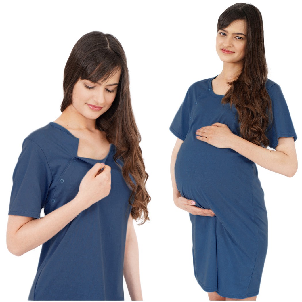 Koszula nocna ciążowa z krótkim rękawem wykonana z miękkiego i przyjemnego w dotyku materiału, który po wielokrotnym praniu pozostaje w niezmienionym stanie. Zaprojektowana w bardzo wygodnym fasonie - delikatnie okrywa brzuszek w ciąży. Idealna w okresie karmienia. Piżamka ta posiada specjalnie zaprojektowany system, który ułatwia karmienie, a wycięcia z przodu do karmienia zapinane są na napki.