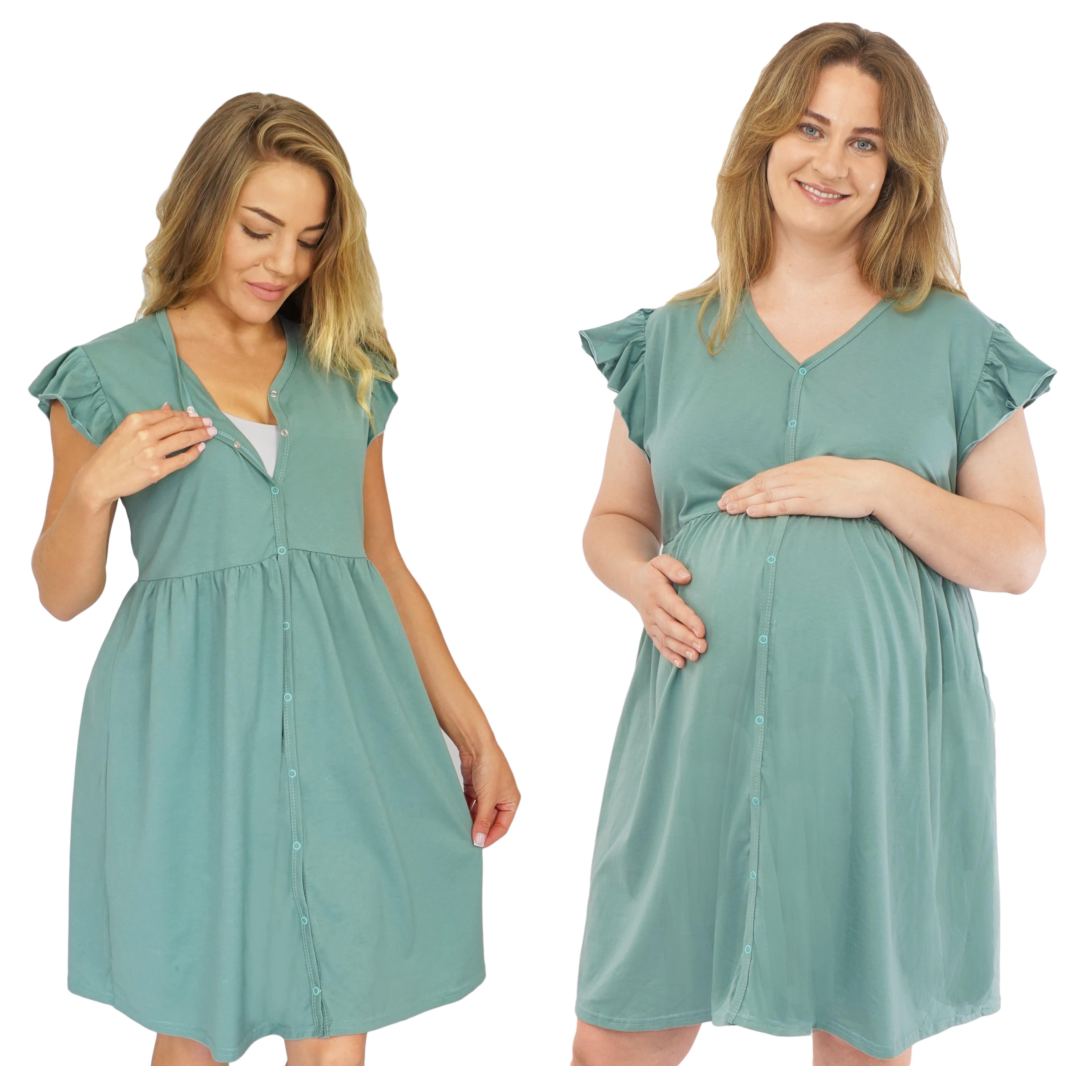 Zielona koszula ciążowa rozpinana z przodu po całej długości - stworzona w odpowiedzi na wyzwania jakie czekają przyszłe i świeżo upieczone mamy