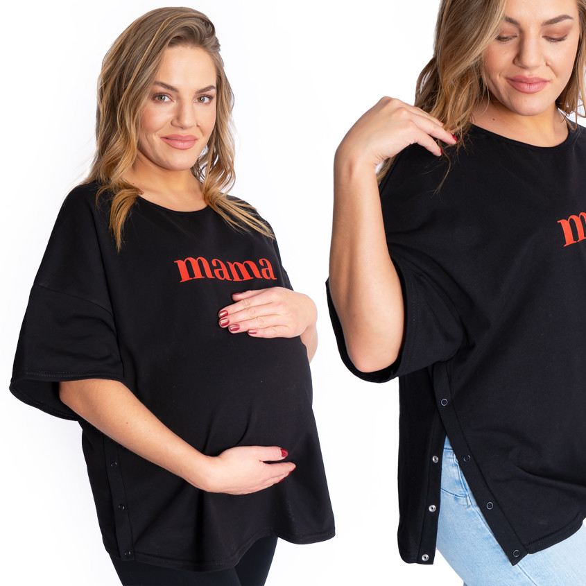 Czarna bluzka ciążowa koszulka do karmienia z napisem MAMA rozpinana na napy