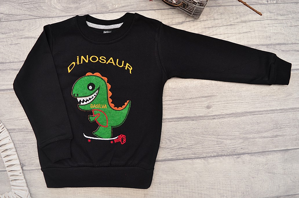 Bluza z długim rękawem w kolorze czarnym. Dół, dekolt oraz rękawy bluzy wykończone graczarnym ściągaczem. Bluza wkładana przez głowę. Wyjątkowego stylu tej chłopięcej bluzie dresowej dodaje aplikacja zielonego dinozaura oraz wyszywany, żółty napis DINOZAUR.
