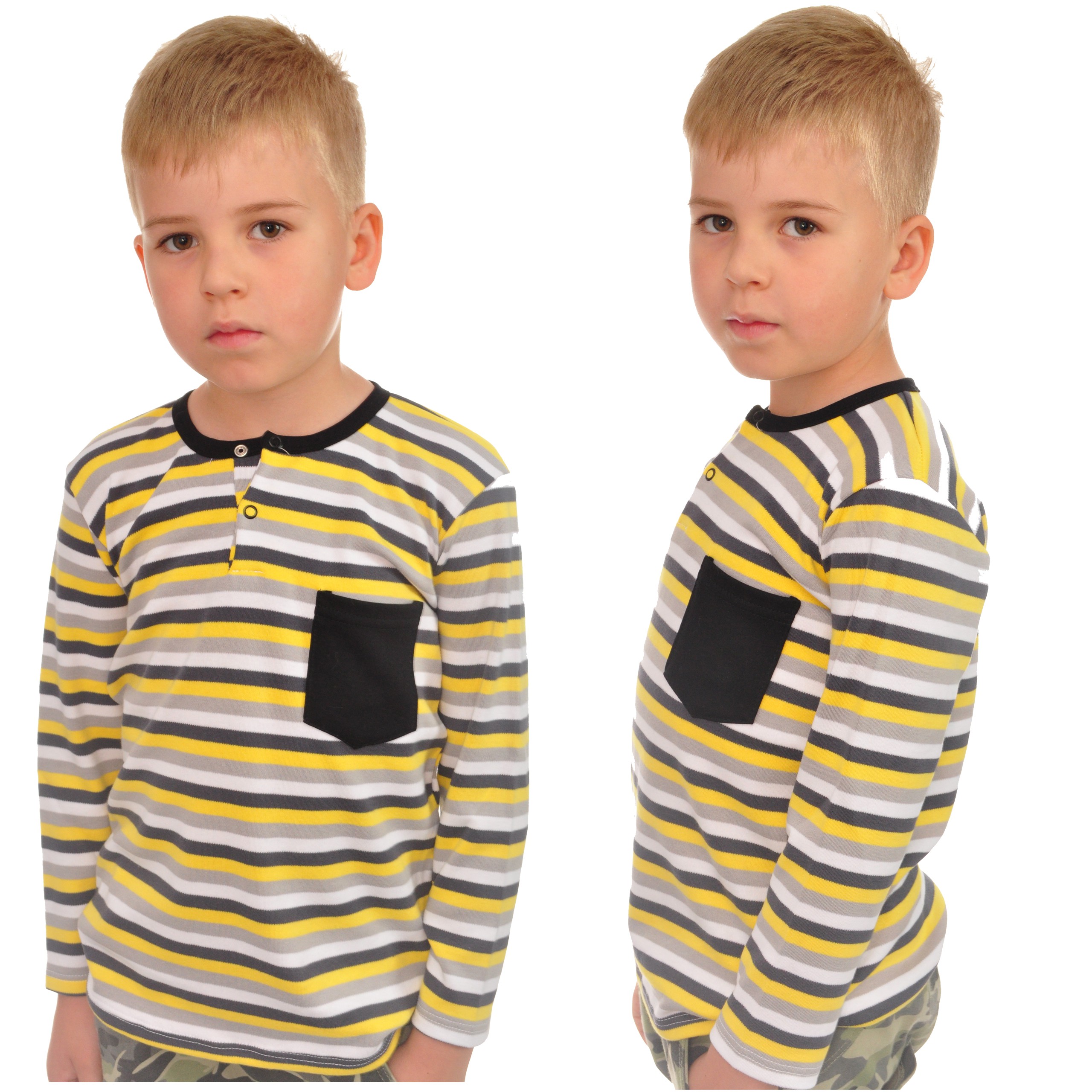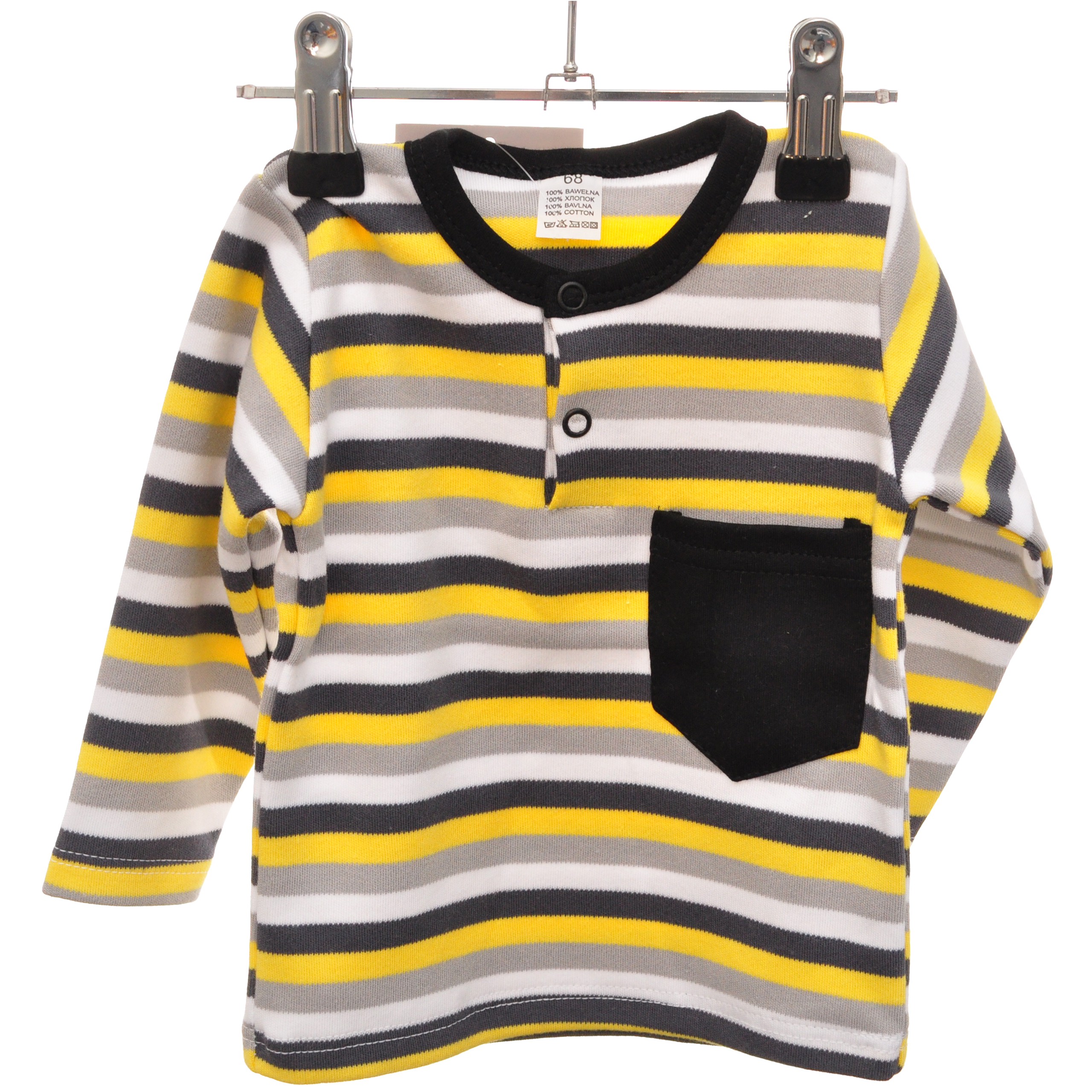 Bawełniana koszulka dla chłopca typu POLO, odpinana przy dekolcie na dwie bezniklowe napki. Wyjątkowego stylu tej chłopięcej bluzeczce z długim rękawem dodaje umieszczona z przodu kieszonka w kolorze czarnym.