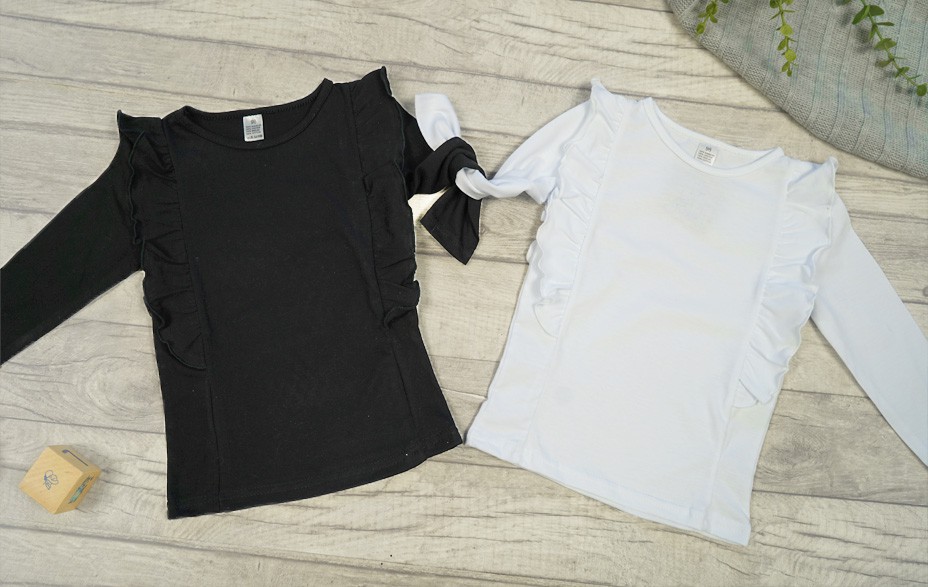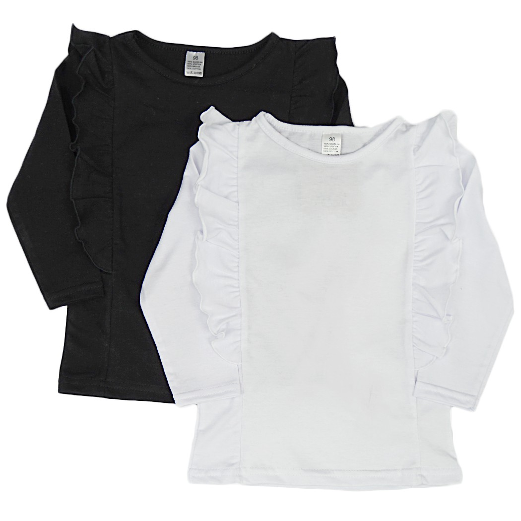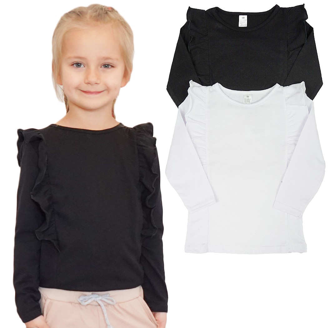 Biała oraz czarna dziewczęca koszulka z długim rękawem 2 pak wkładana przez głowę. Koszulka dziewczeca sprawdzi się idealnie zarówno na co dzień jak i na specjalne okazje. Dziewczęce koszulki 2-pak są wykonane z 100% gładkiej bawełny. Bluzka dla dziewczynki ozdobiona jest dwiema falbankami puszczonymi od ramion z przodu i tyłu zapewni dziewczynce lekkości oraz doda elegancji stylizacji.