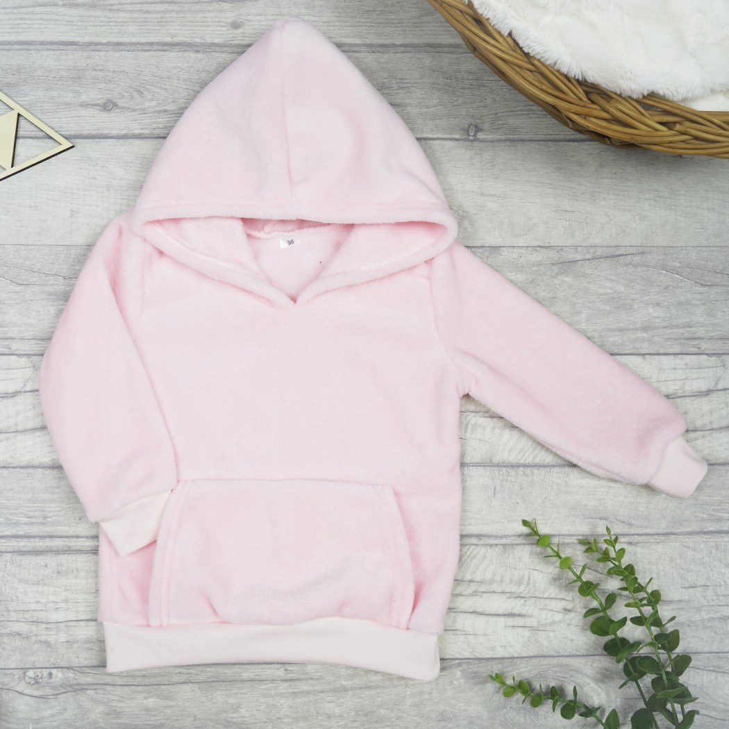 Bluza z długim rękawem z kapturem oraz przednią kieszenią w stylu kangurki. Dół oraz rękawy bluzy wykończone ściągaczem. Bluza dziecięca wkładana przez głowę. Ciepła, dresowa bluza wykonana z miękkiego, grubego pluszu pokryta ciepłym meszkiem również od wewnątrz.