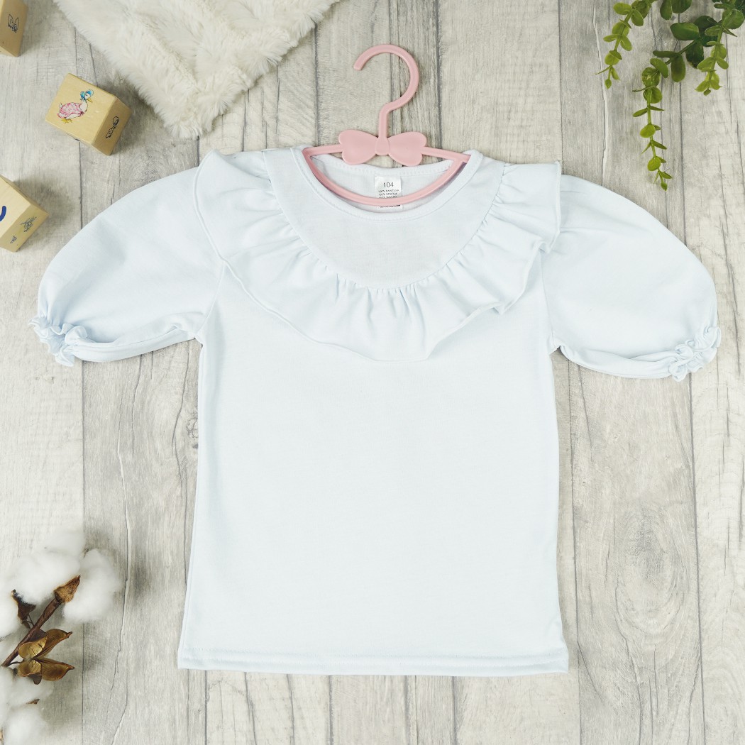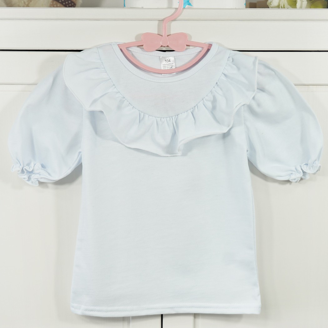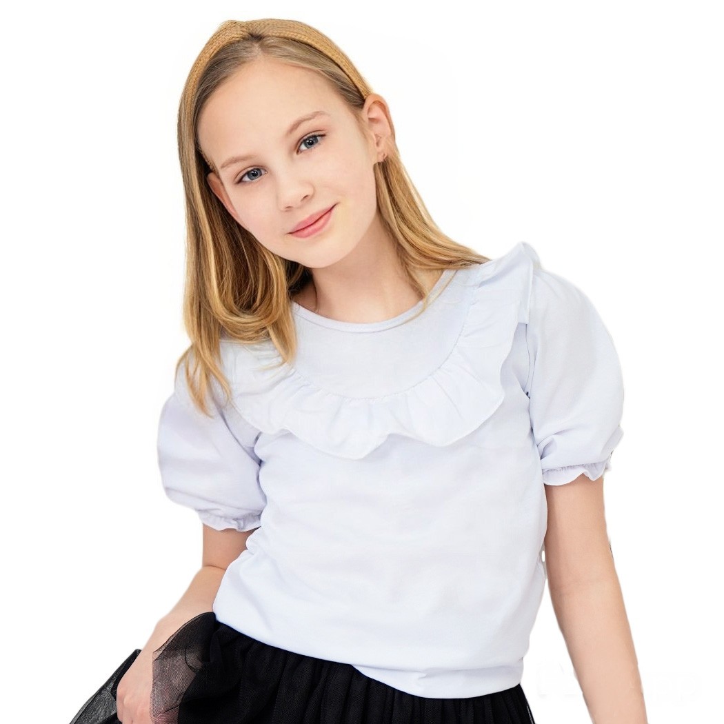 Biała dziewczęca koszulka z krótkim rękawem wkładana przez głowę. Koszulka dziewczęca sprawdzi się idealnie zarówno na co dzień jak i na specjalne okazje oraz na wszystkie szkolne akademie. Dziewczęca koszulka jest wykonana z 100% gładkiej bawełny. Bluzka dla dziewczynki ozdobiona jest falbanką przy dekolcie oraz bufiastymi rękawkami na delikatnej gumeczce, dzięki którym zapewni dziewczynce lekkości oraz doda elegancji stylizacji.