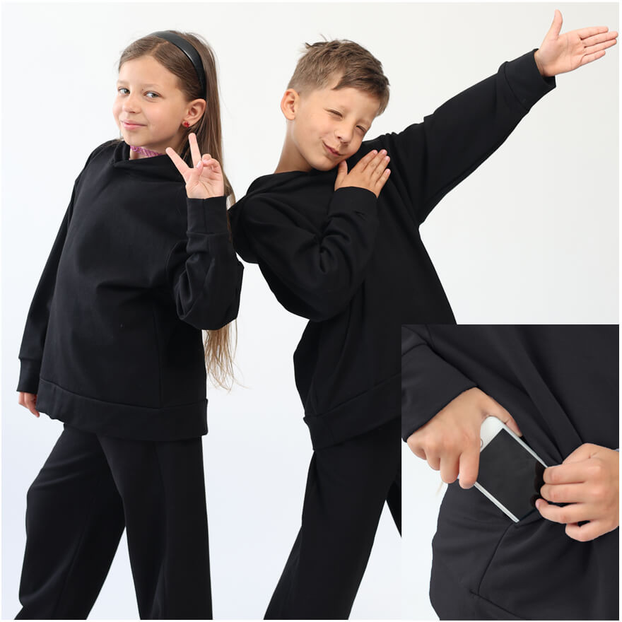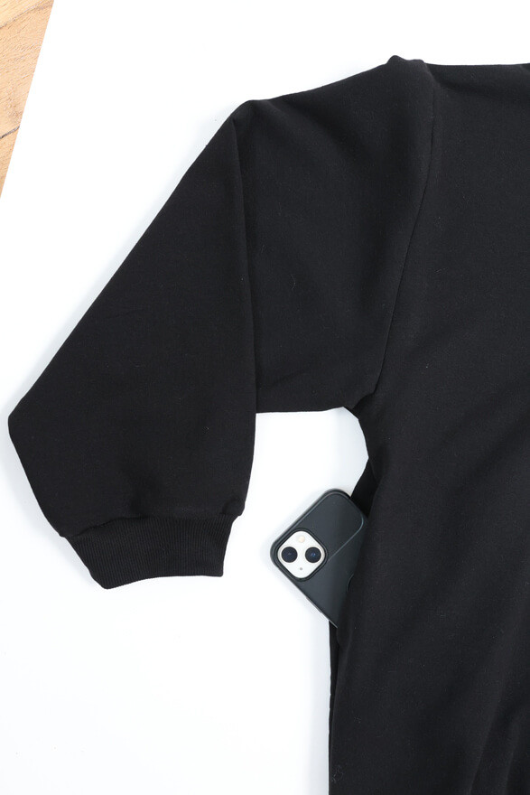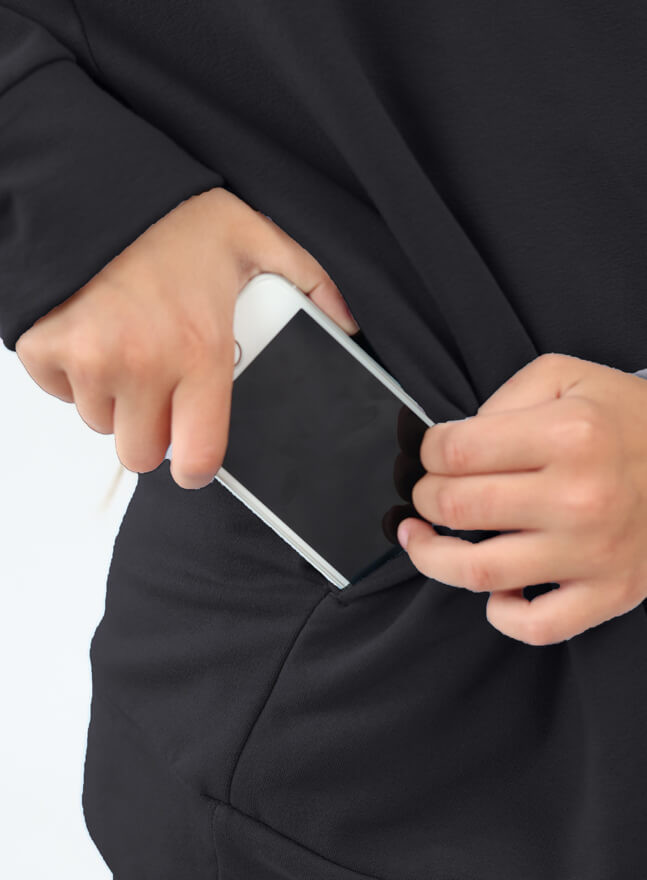 Bluza dresowa na meszku z UKRYTĄ KIESZENIĄ NA TELEFON w kolorze czarnym.
