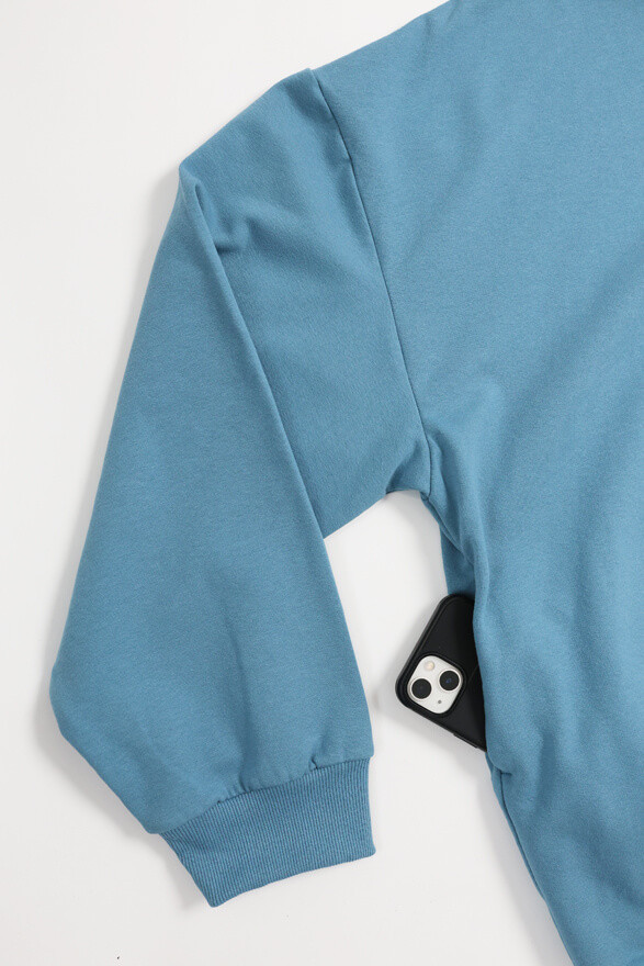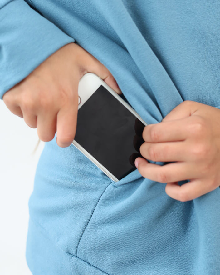 Bluza dresowa na meszku z UKRYTĄ KIESZENIĄ NA TELEFON w kolorze niebieskim.