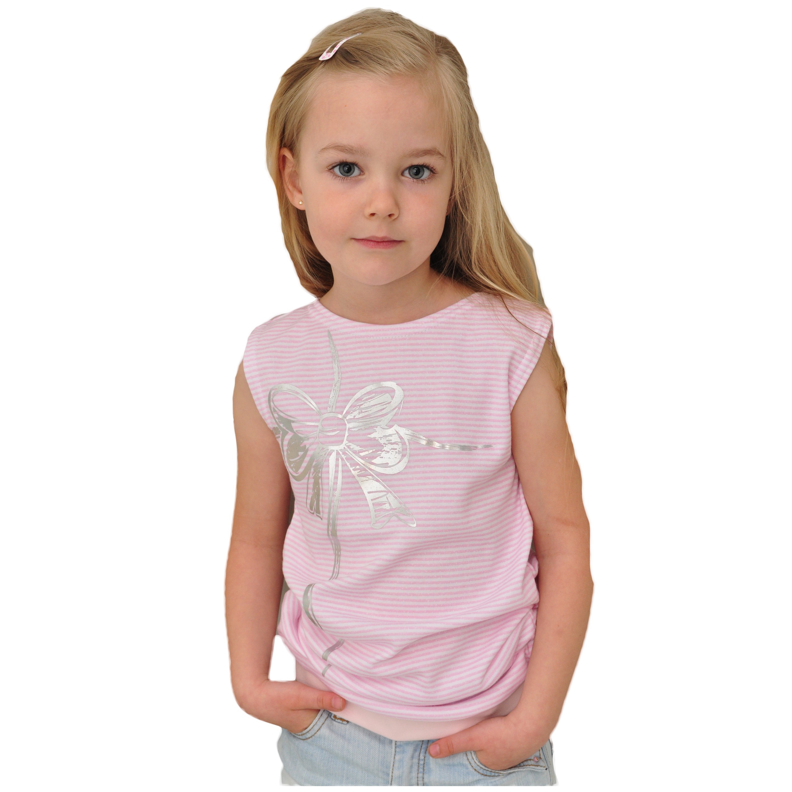 Bawełniana bluzeczka dla dziewczynki w biało-różowe paseczki z błyszczącym srebrnym nadrukiem kokardy.
