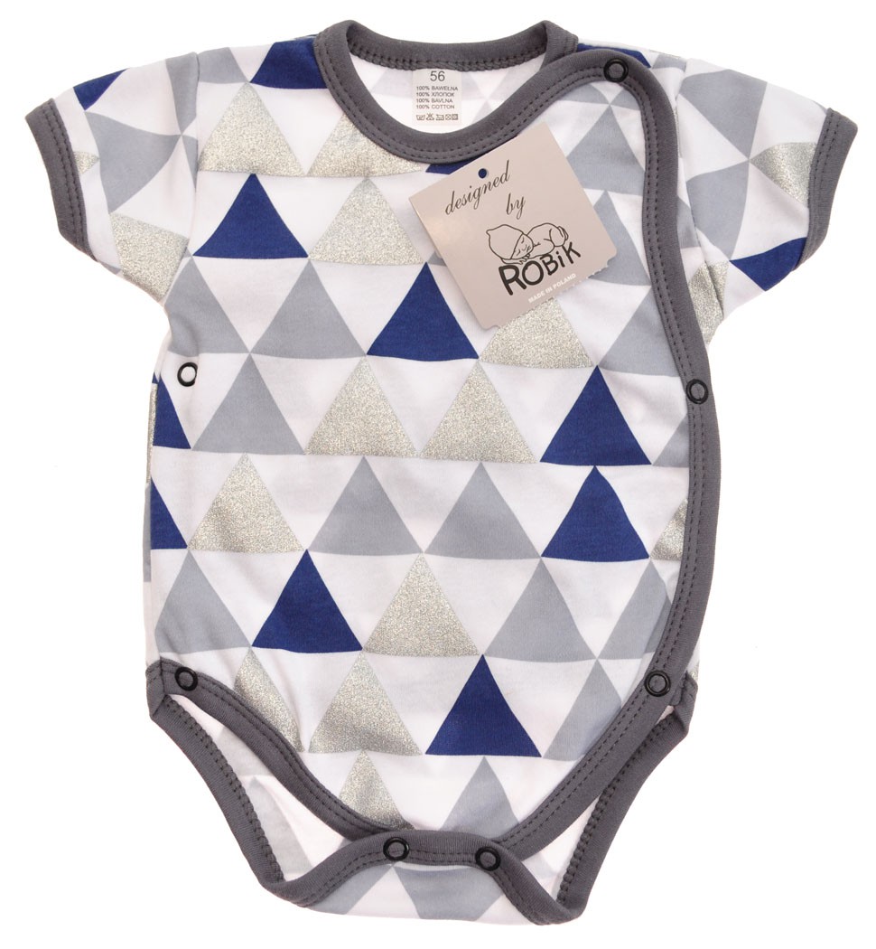 Body z krótkim rękawem o kroju kopertowym. Body jest zapinane na dwie pary bezniklowych napek po bokach oraz dwie napki w kroku co znacznie ułatwia zakładanie ubranka. Bawełniane body dla niemowlaków uszyte z dzianiny drukowanej w trójkąty w białym, granatowym, szarym i srebrnym kolorze. Srebrne trójkąty delikatnie błyszczą dzięki zastosowaniu brokatowego nadruku. Body zostało wykończone delikatną grafitową lamówką.