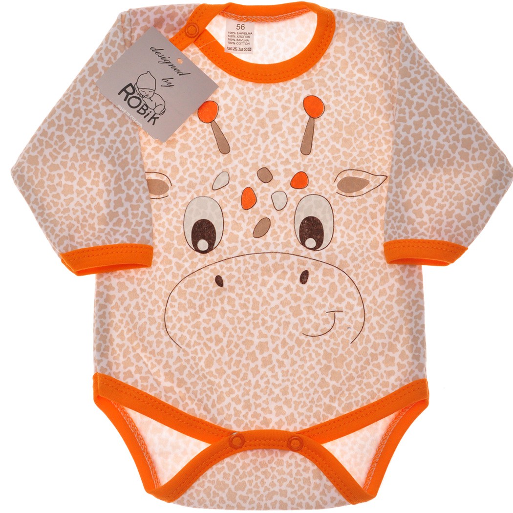 Body bawełniane uszyte z dzianiny w cętki żyrafy z nadrukiem wykonanym trwałą, bezpieczną dla dziecka metodą sitodruku, wykończone pomarańczową lamówką. Niezwykle wygodne i przewiewne klasyczne body dziecięce zapinane na ramieniu oraz w kroku na zatrzaski zapewniają komfort i swobodę ruchów. Obecne są w trakcie kompletowania wyprawki dla noworodka i nie może ich zabraknąć w szafie niemowlaka. Body dziecięce to doskonały wybór sprawdzający się aż do momentu, w którym maluch nauczy się korzystać z nocnika.