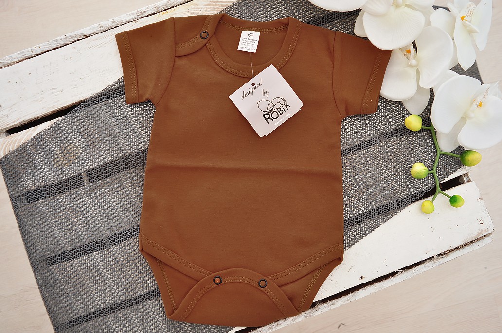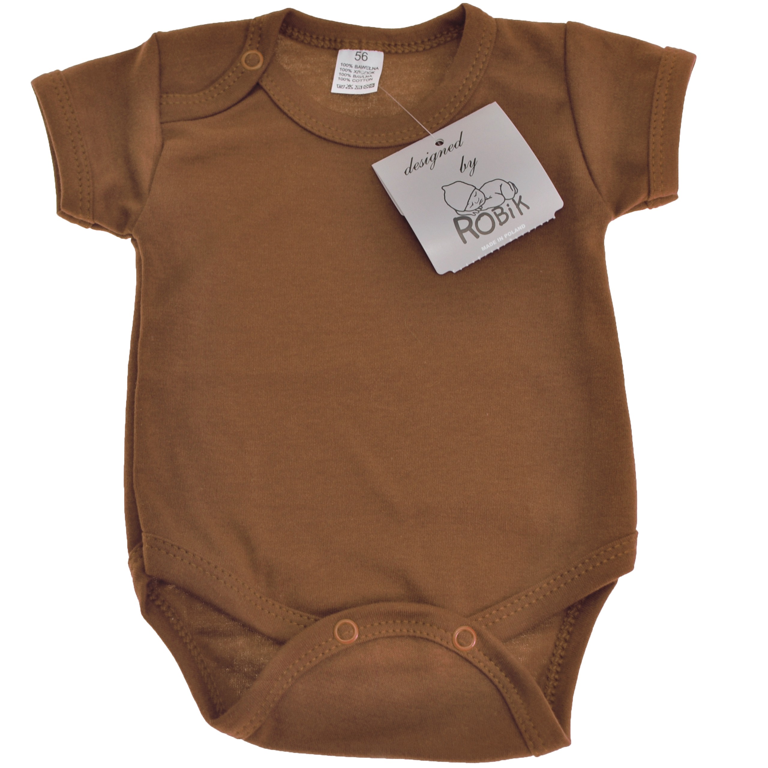 Dziecięce body z krótkim rękawem, w kolorze brązowym.