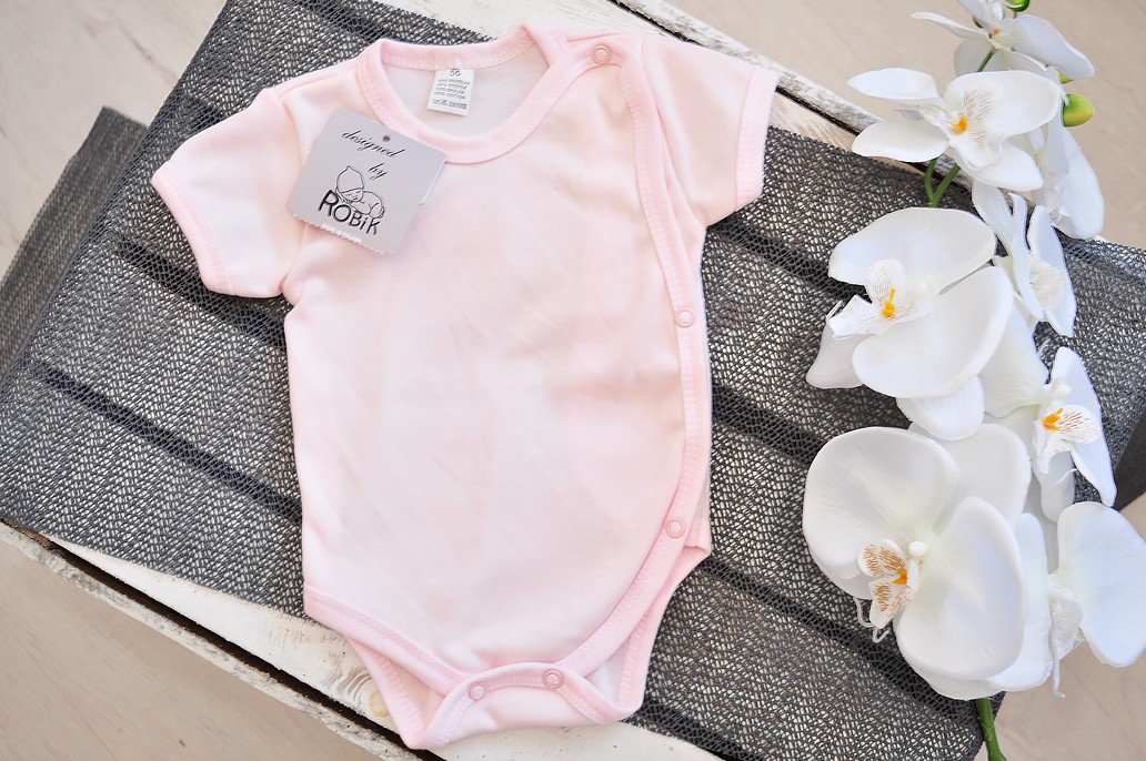 Niemowlęce body kopertowe z krótkim rękawem w kolorze pastelowego różu.