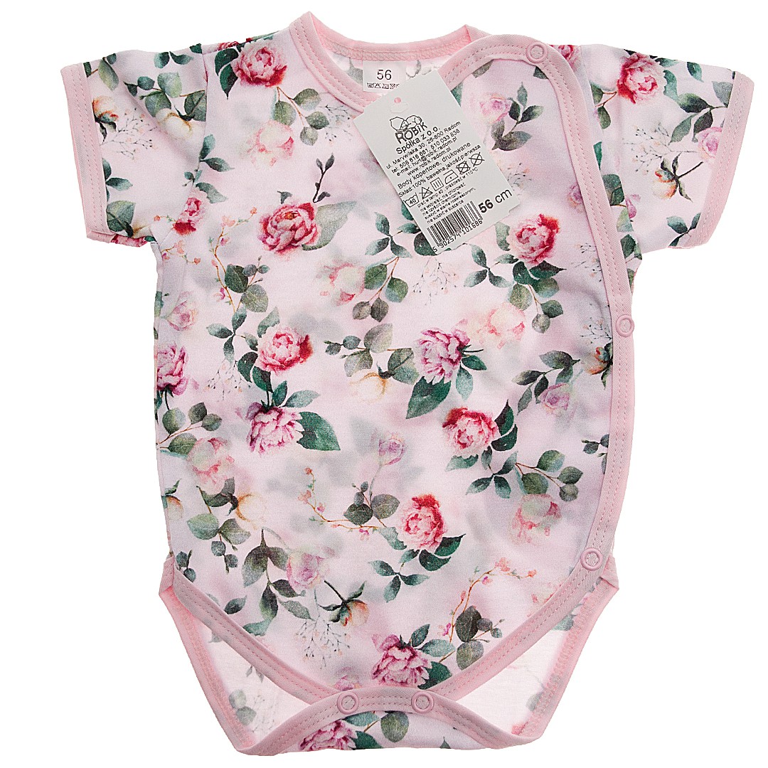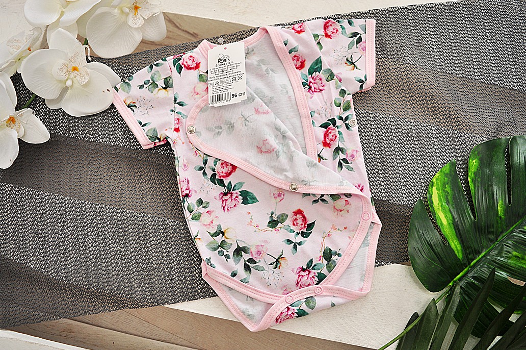 Niemowlęce body kopertowe z krótkim rękawem w kwiaty.