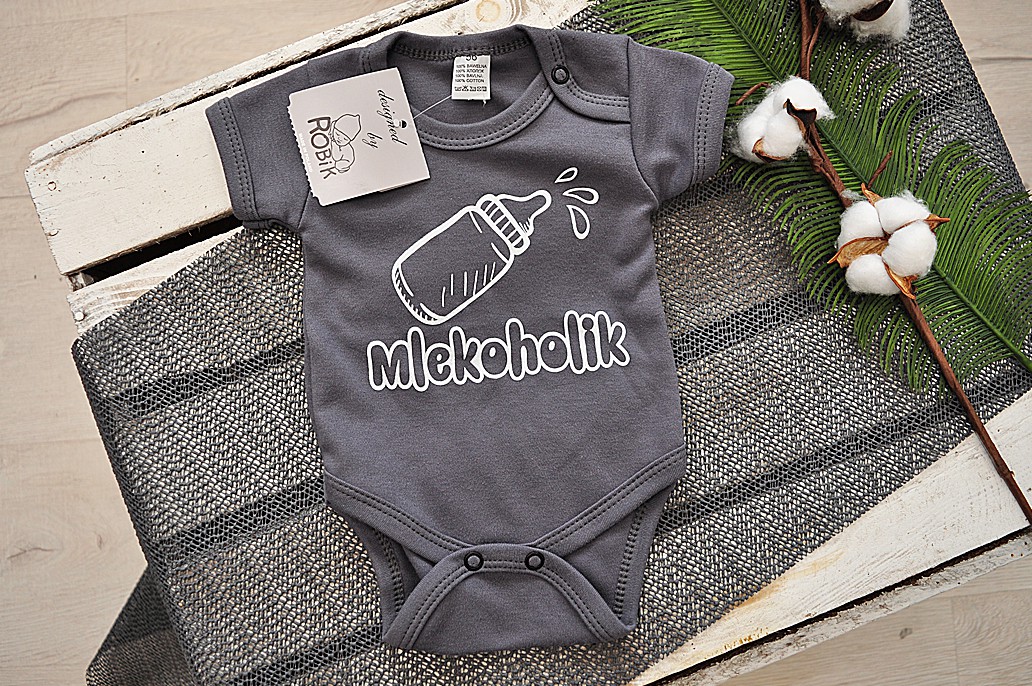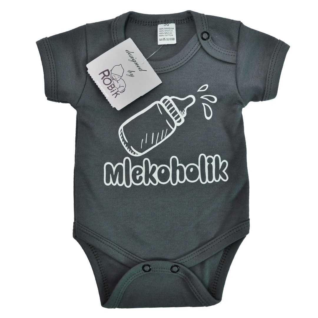 Body dla chłopca z krótkim rękawem z nadrukiem butelki z mlekiem i napisem MLEKOHOLIK
