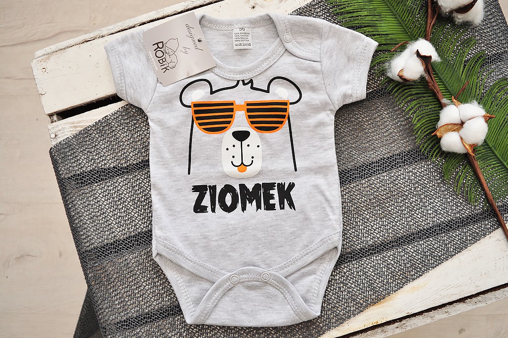 Body dla chłopca z krótkim rękawem z nadrukiem misia i napisem ZIOMEK.