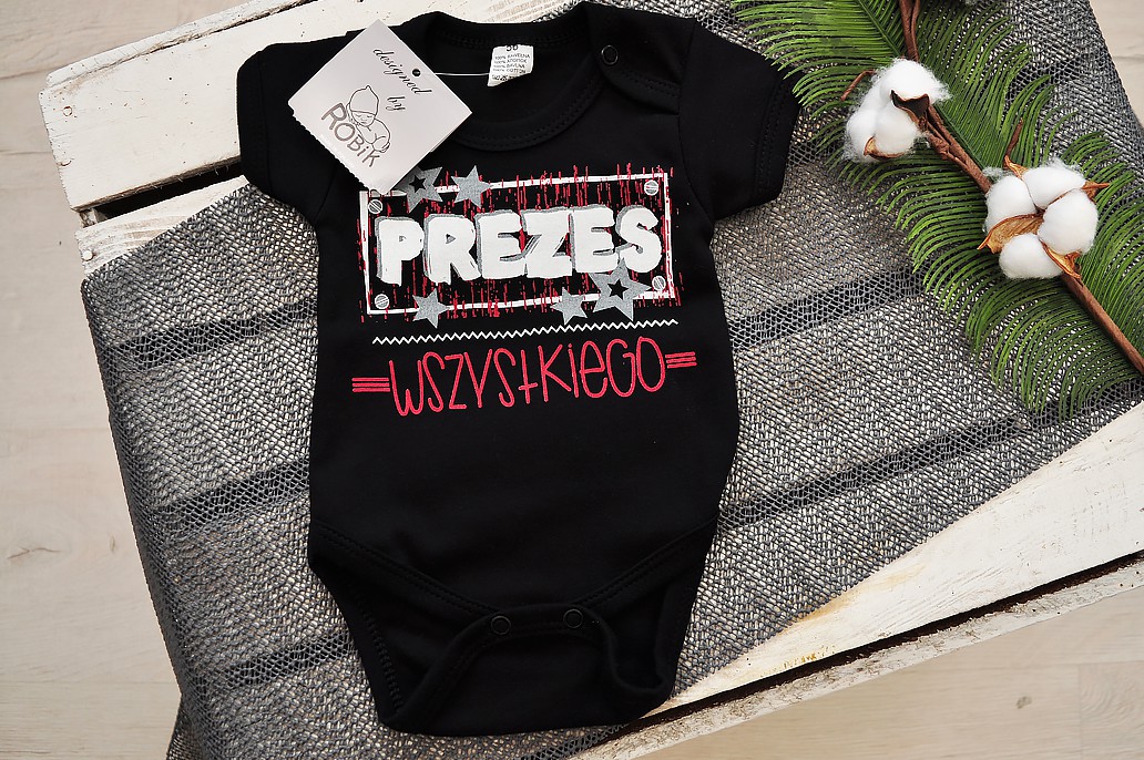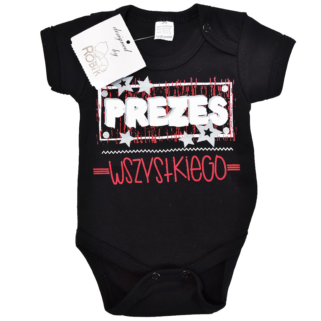 Czarne BODY chłopięce PREZES WSZYSTKIEGO krótki rękaw LATO wzór 619kr