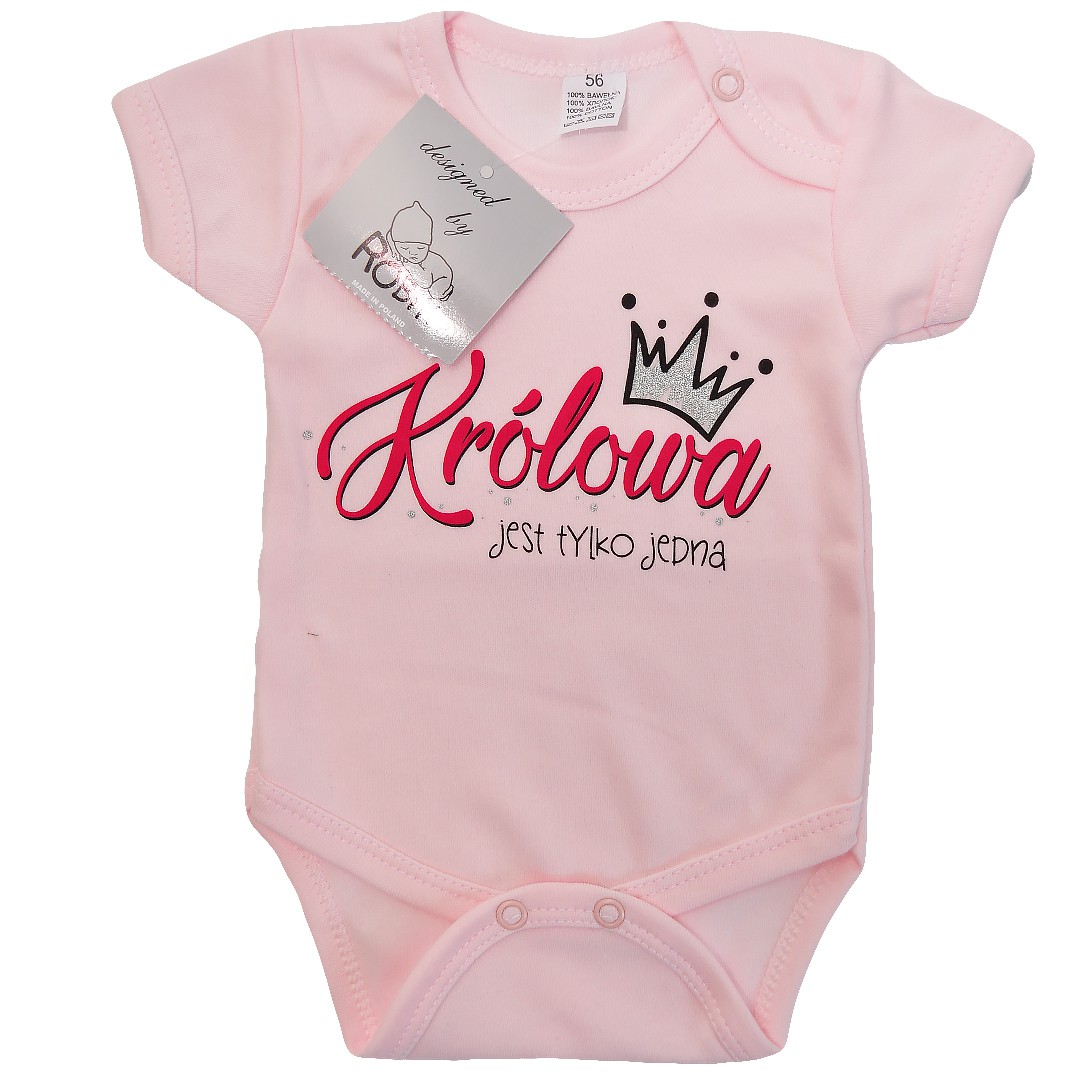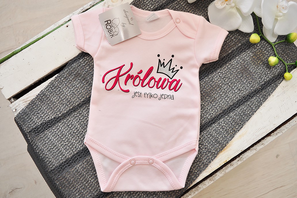 Body dziewczęce bawełniane z napisem "Królowa jest tylko jedna" w kolorze różowym z zabawnym nadrukiem, wykonanym trwałą, bezpieczną dla dziecka metodą sitodruku, wykończone różową lamówką. Niezwykle wygodne i przewiewne klasyczne dziecięce body krótki rękaw zapinane na ramieniu oraz w kroku na zatrzaski sprawdzą się w upalne letnie dni, zapewniając komfort i wygodę ruchów. Mogą także służyć jako baza pod pajace czy śpioszki.