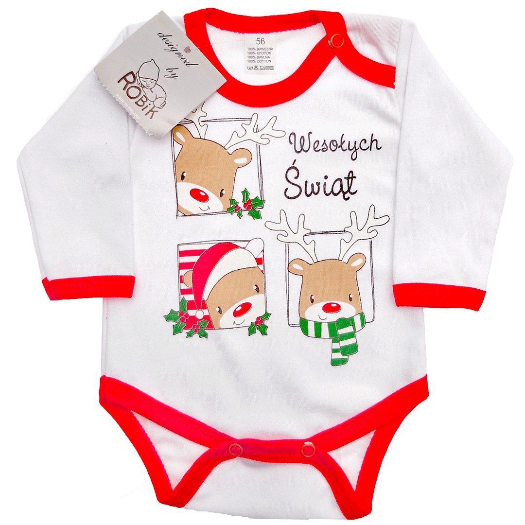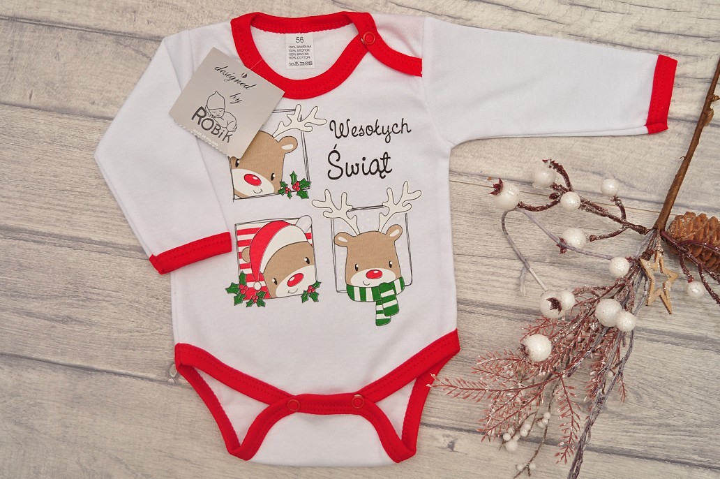 Świąteczne body długi rękaw sprawdzą się idealnie jako góra do spodenek i legginsów.