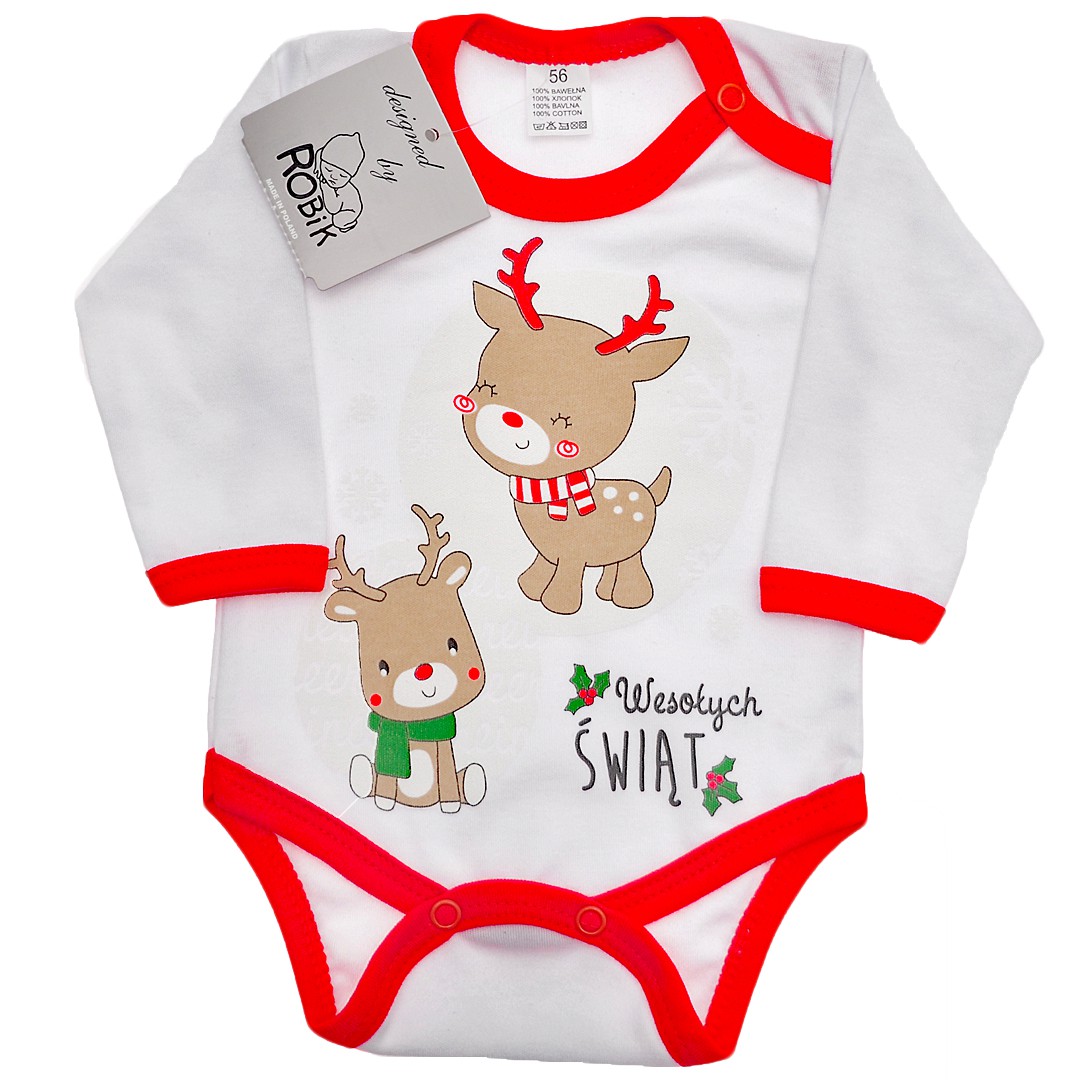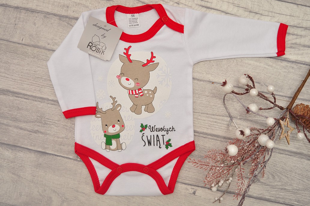 Świąteczne body długi rękaw sprawdzą się idealnie jako góra do spodenek i legginsów.