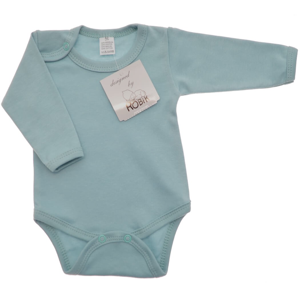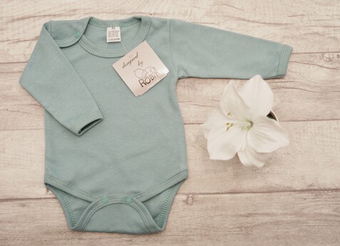 Praktyczne body niemowlęce z długim rękawem w kolorze szaro miętowym.