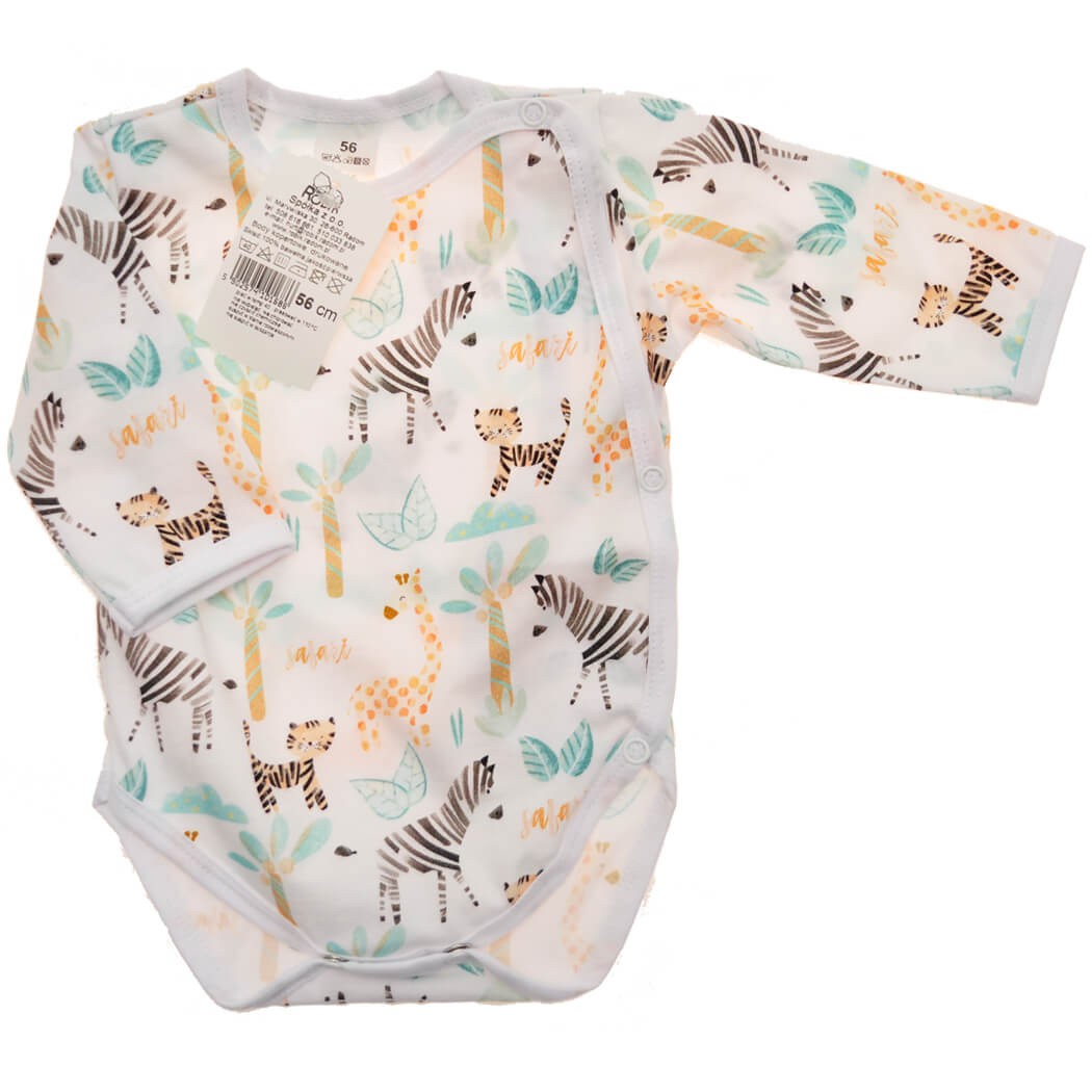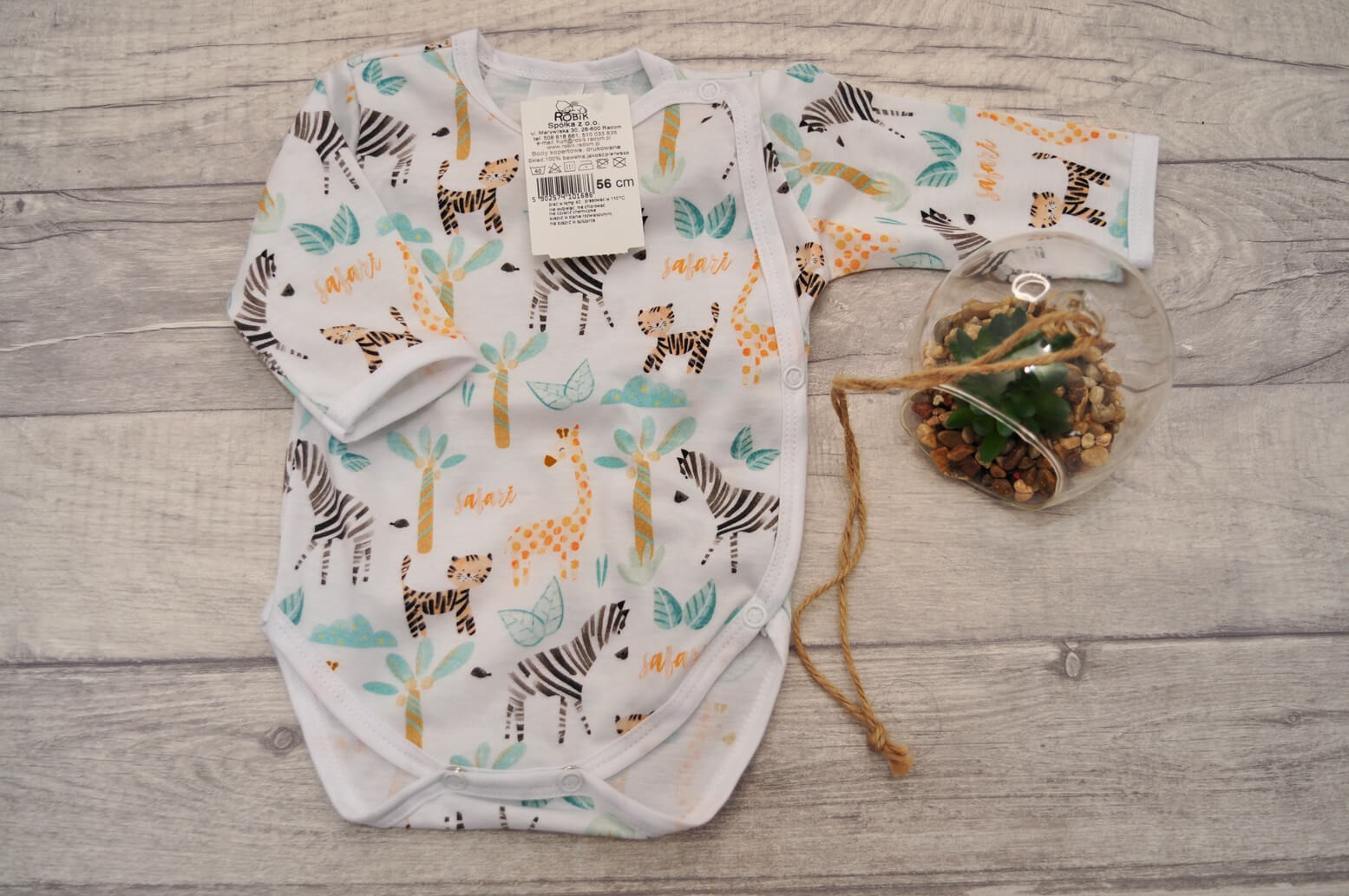 Body z długim rękawem o kroju kopertowym, zapinane na dwie pary bezniklowych napek po bokach oraz dwie napki w kroku co znacznie ułatwia zakładanie ubranka. W środku niepełna koperta. Kopertowe body dla niemowlaka uszyte z bawełny z nadrukiem to produkt polski a elastyczny, wysokiej jakości materiał gwarantuje wygodę i swobodne ruchy dziecka oraz odpowiednią termoregulację.