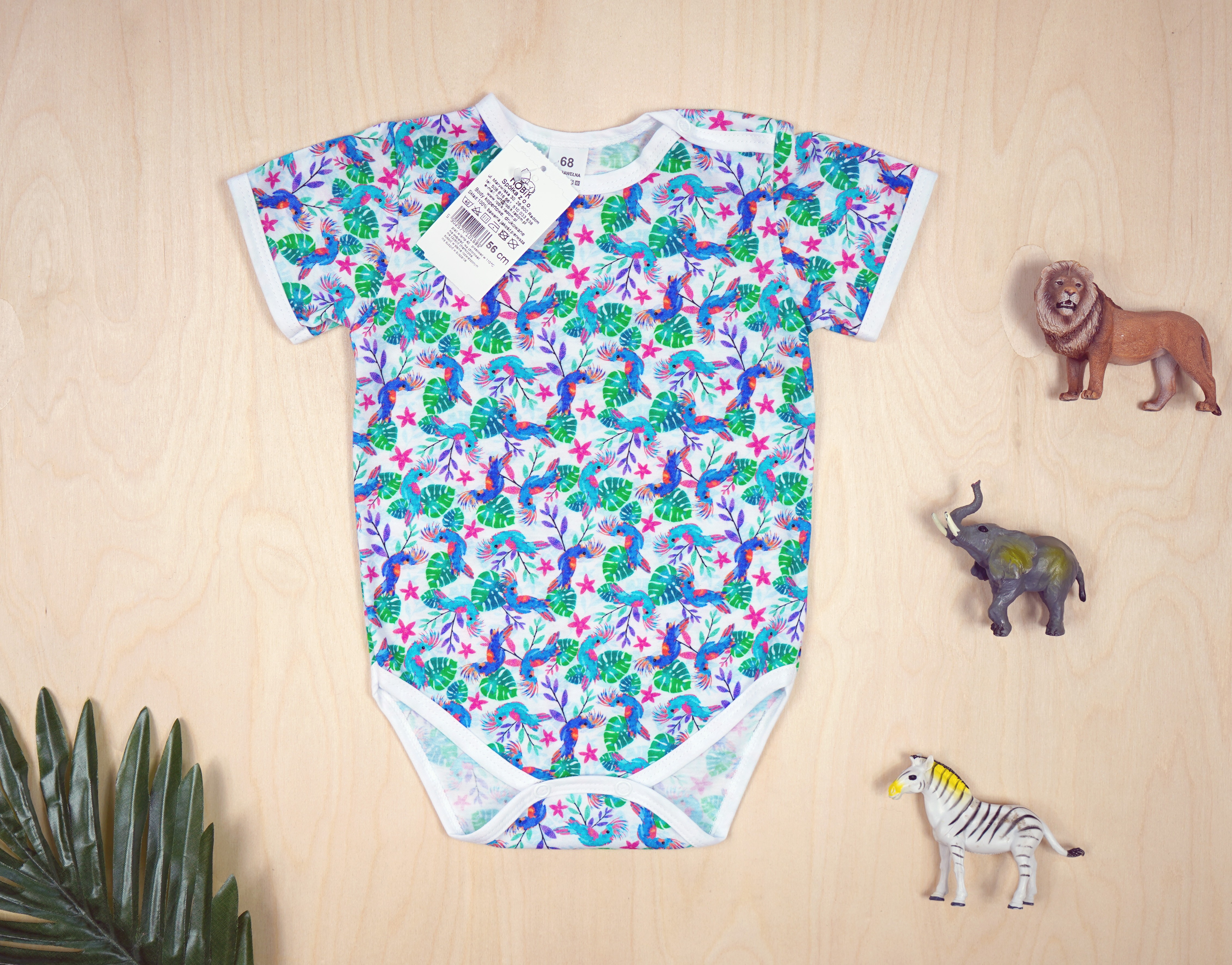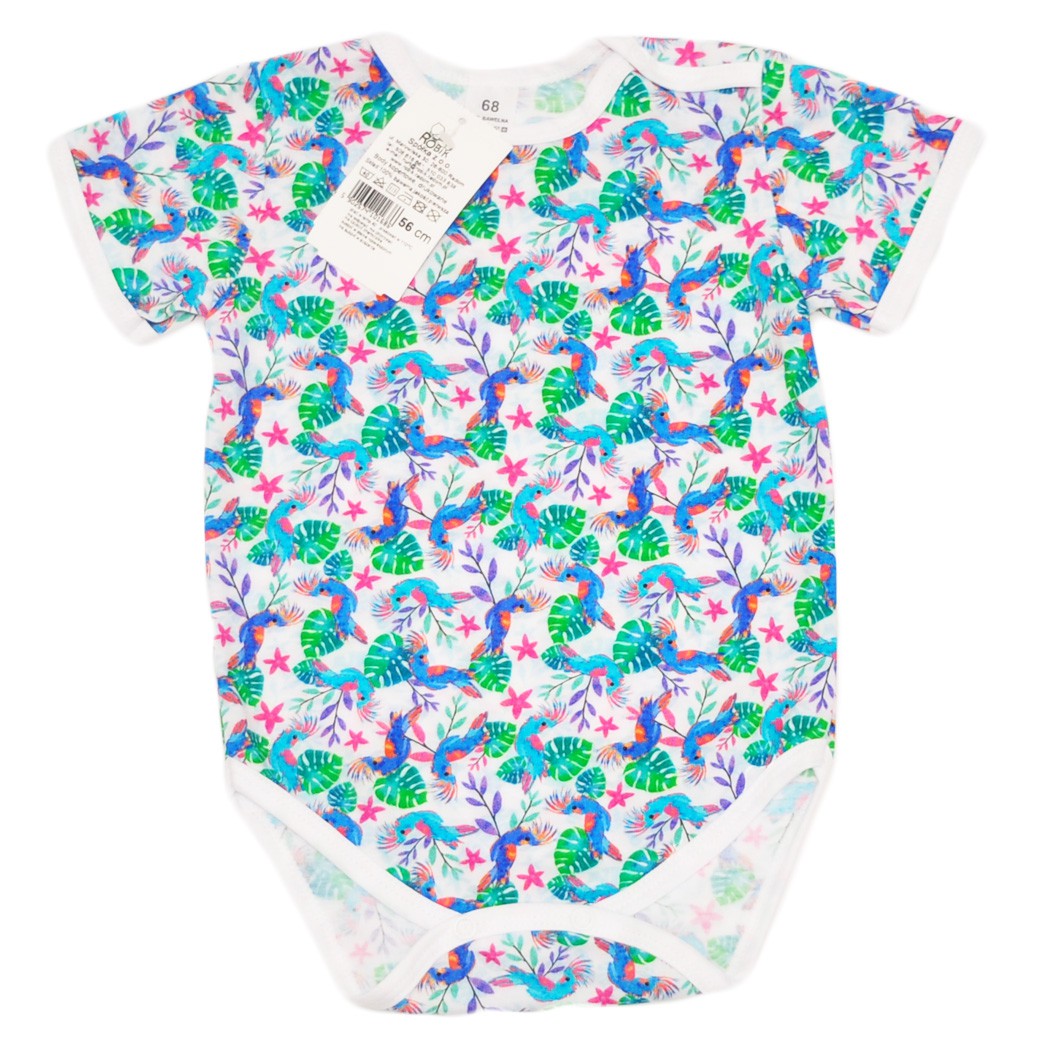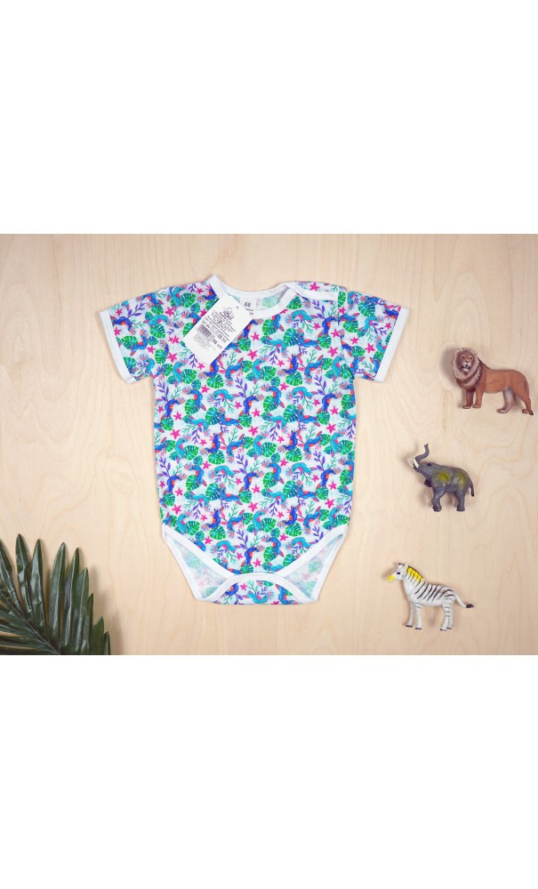Niemowlęce body klasyczne z krótkim rękawem w zielone liście i papugi.