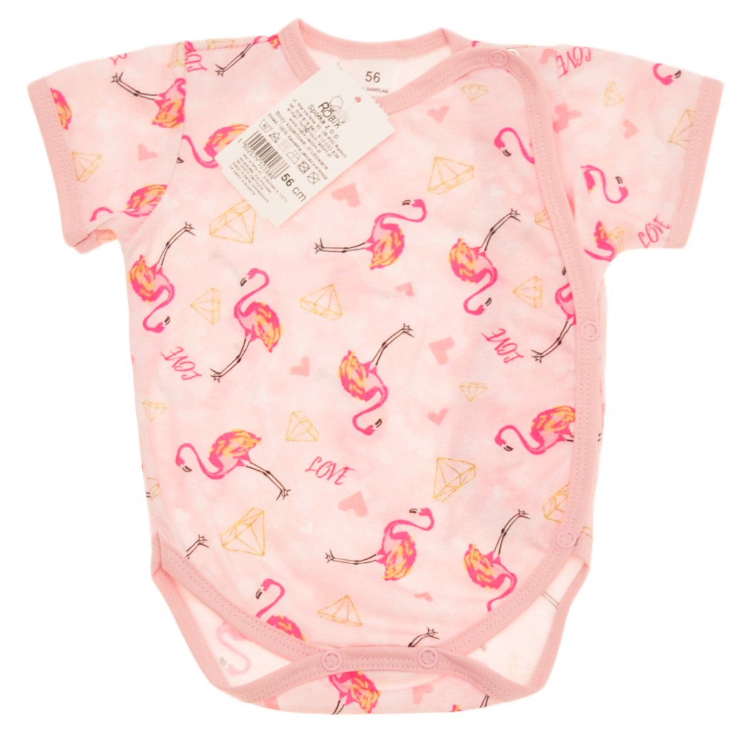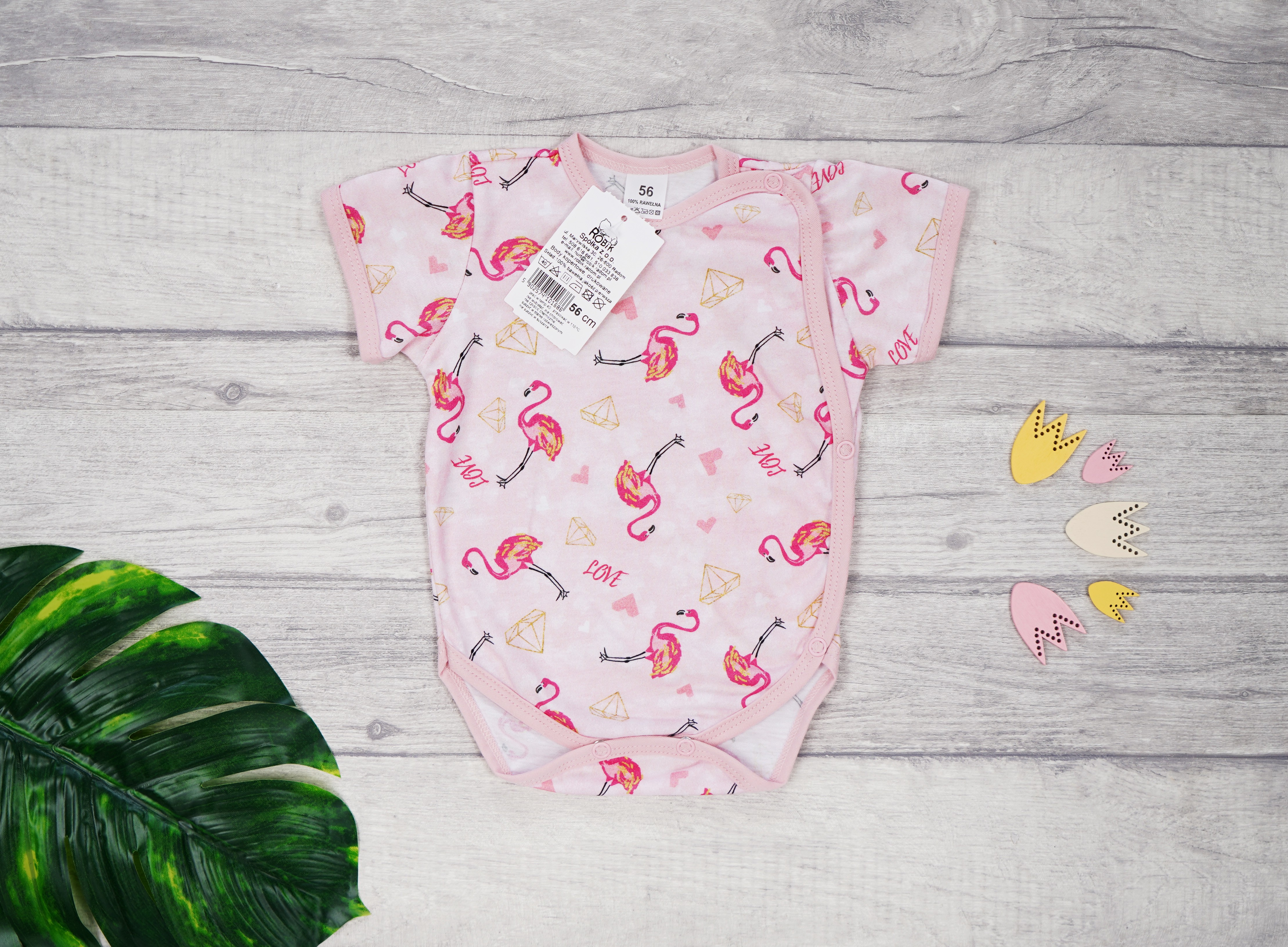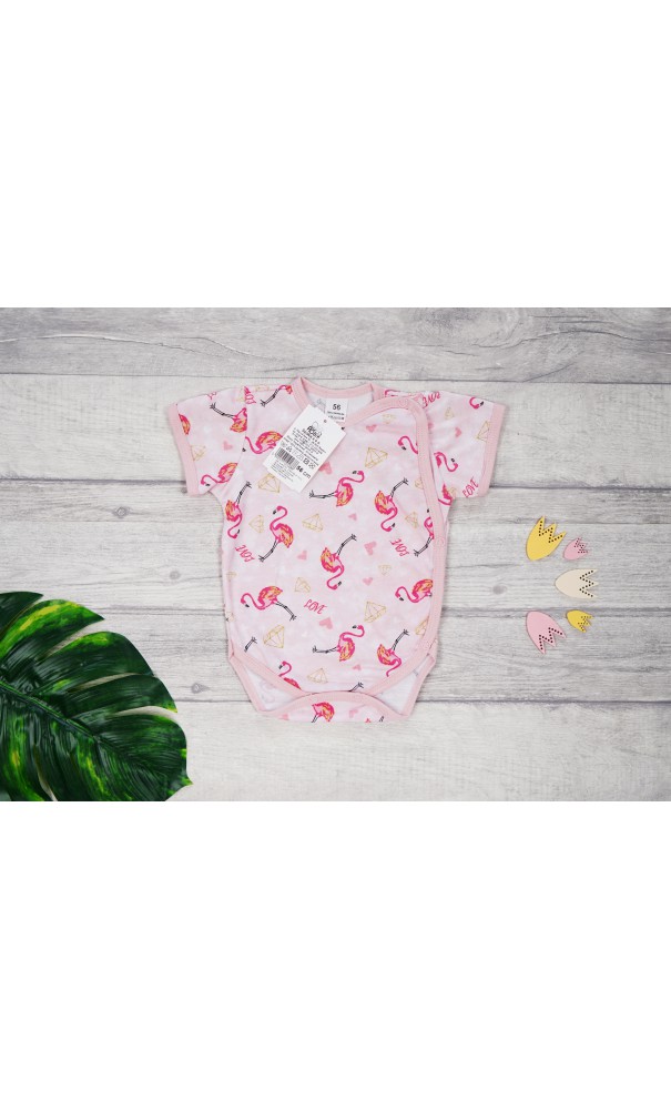 Niemowlęce body kopertowe z krótkim rękawem we flamingi.