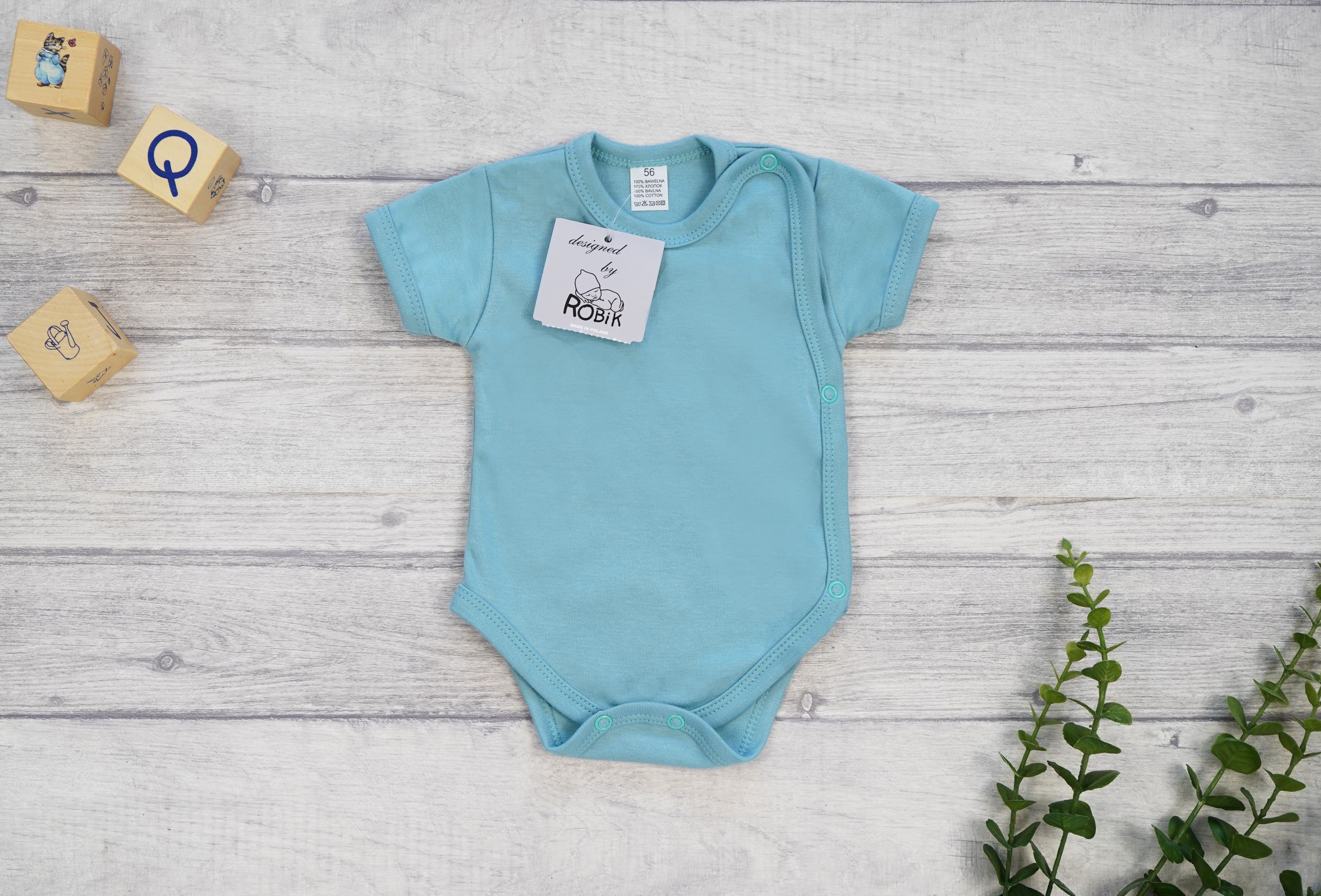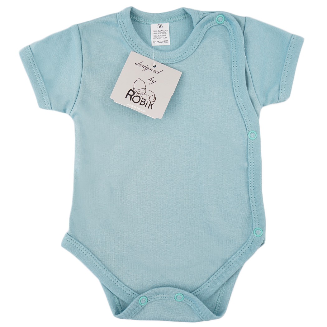 Jednokolorowe body z krótkim rękawem o kroju kopertowym, zapinane na dwie pary bezniklowych napek po bokach oraz dwie napki w kroku co znacznie ułatwia zakładanie ubranka. W środku niepełna koperta. Iceberg body kopertowe dla niemowlaka uszyte z bawełny to produkt polski. Elastyczny, wysokiej jakości materiał gwarantuje wygodę i swobodne ruchy dziecka oraz odpowiednią termoregulację.