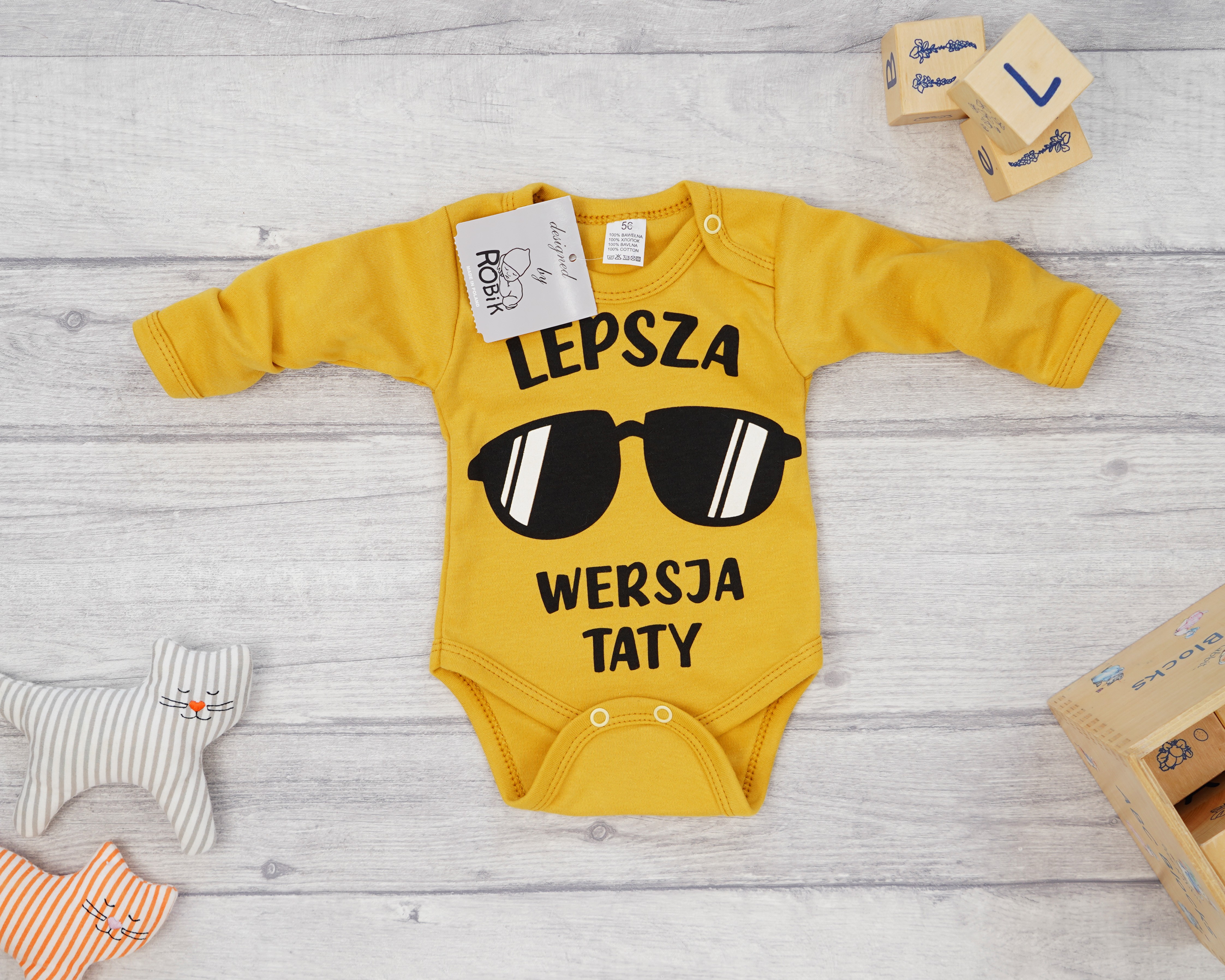 Body dziecięce musztardowe z długim rękawem i napisem: LEPSZA WERSJA TATY