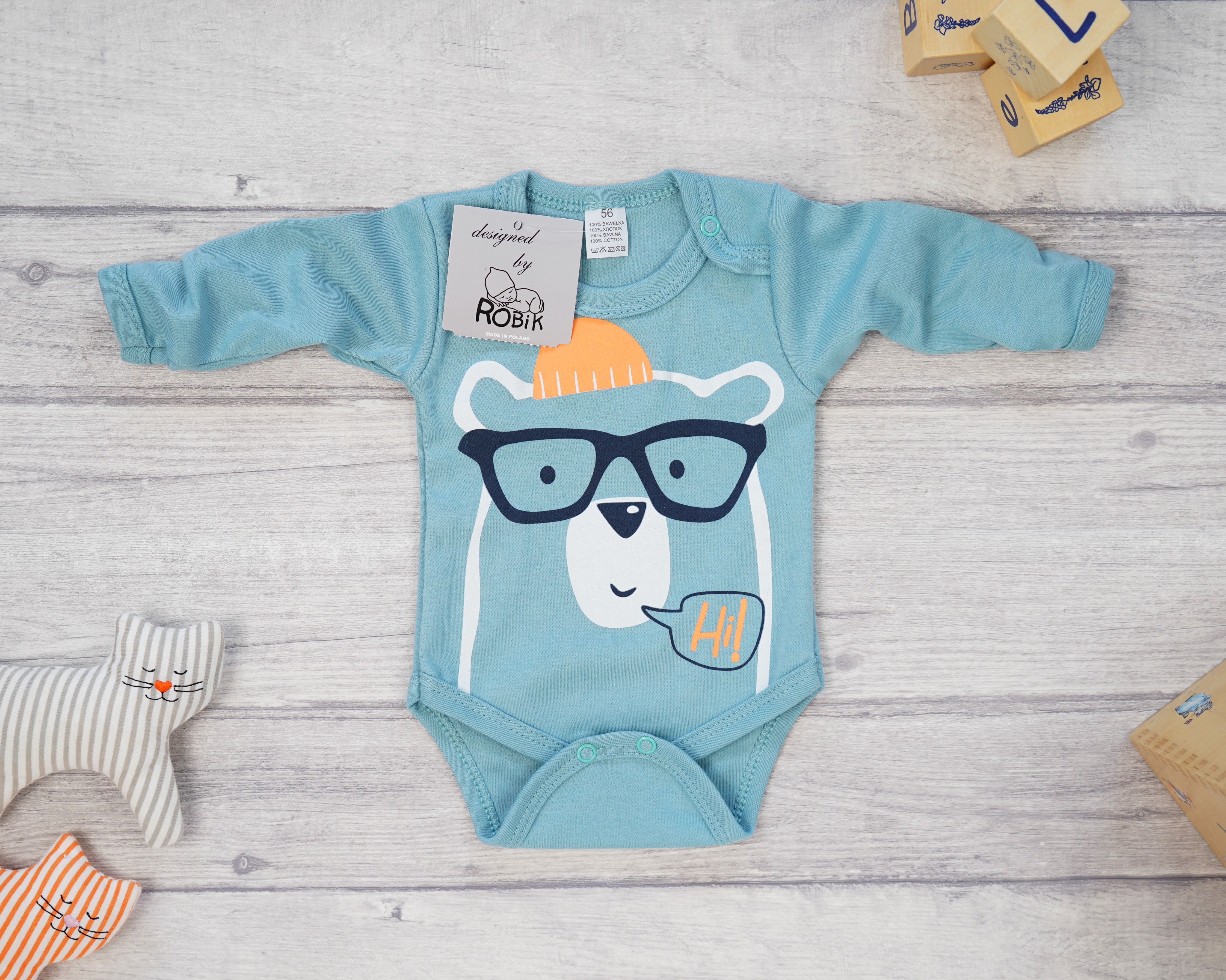 Bawełniane body z arktyczno- niebieskiej dzianiny z nadrukiem wykonanym trwałą, bezpieczną dla dziecka metodą sitodruku. Niezwykle wygodne i przewiewne klasyczne body dziecięce zapinane na ramieniu oraz w kroku na zatrzaski zapewniają komfort i swobodę ruchów. Obecne są w trakcie kompletowania wyprawki dla noworodka i nie może ich zabraknąć w szafie niemowlaka. Body dziecięce to doskonały wybór sprawdzający się aż do momentu, w którym maluch nauczy się korzystać z nocnika.