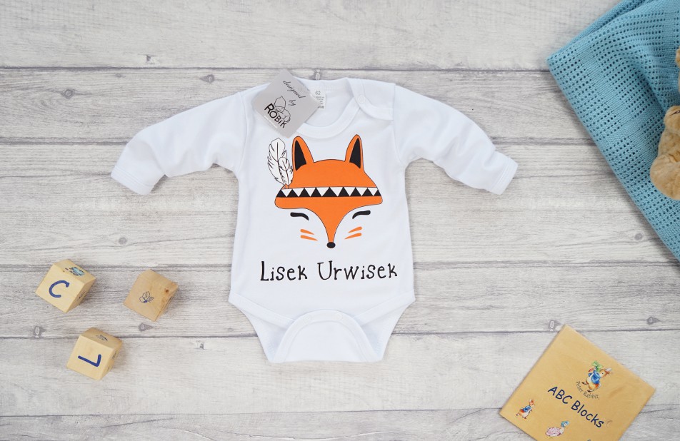 Body dziecięce białe z długim rękawem, liskiem i napisem: LISEK URWISEK