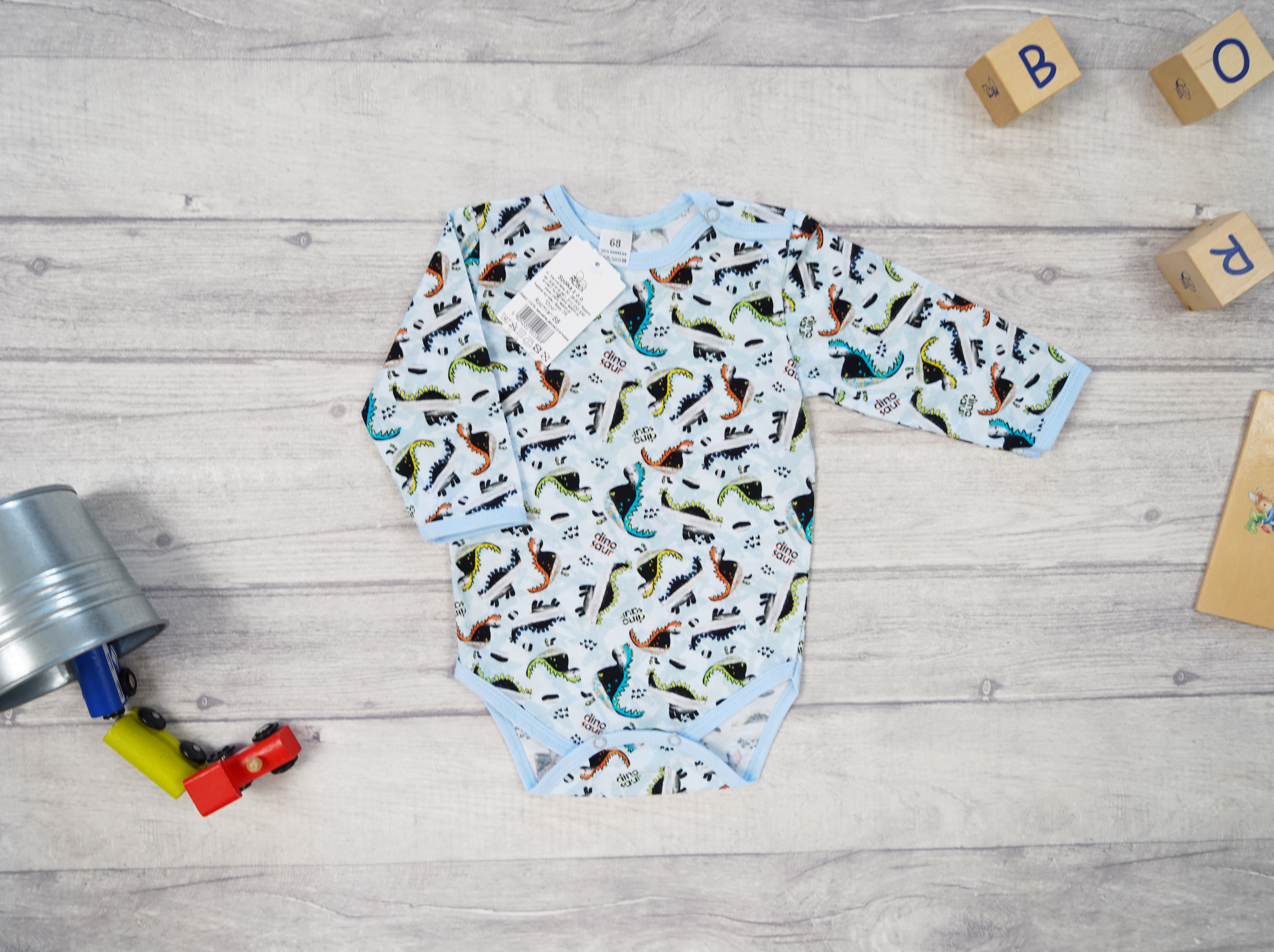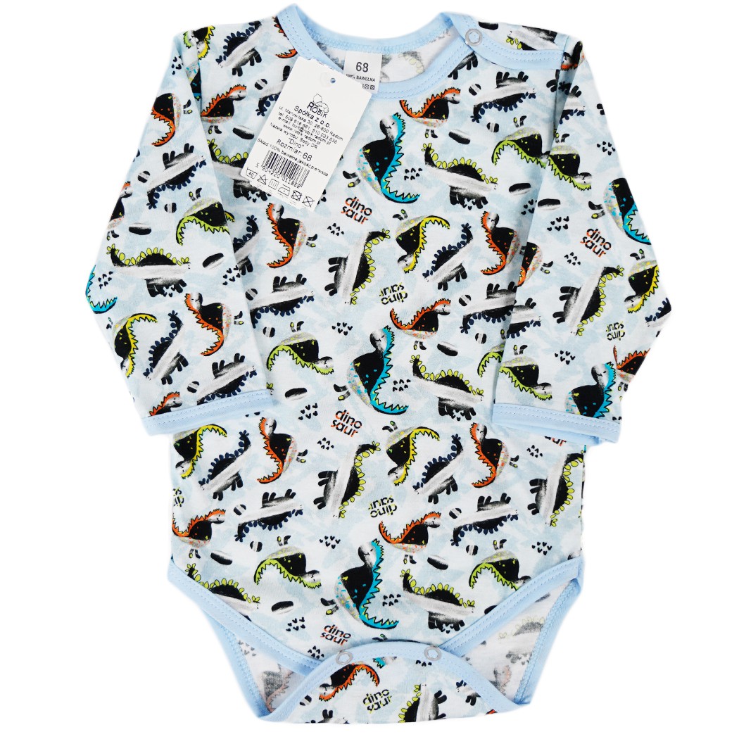 Body dziecięce z długim rękawem w dinozaury na błękitno- białym tle.