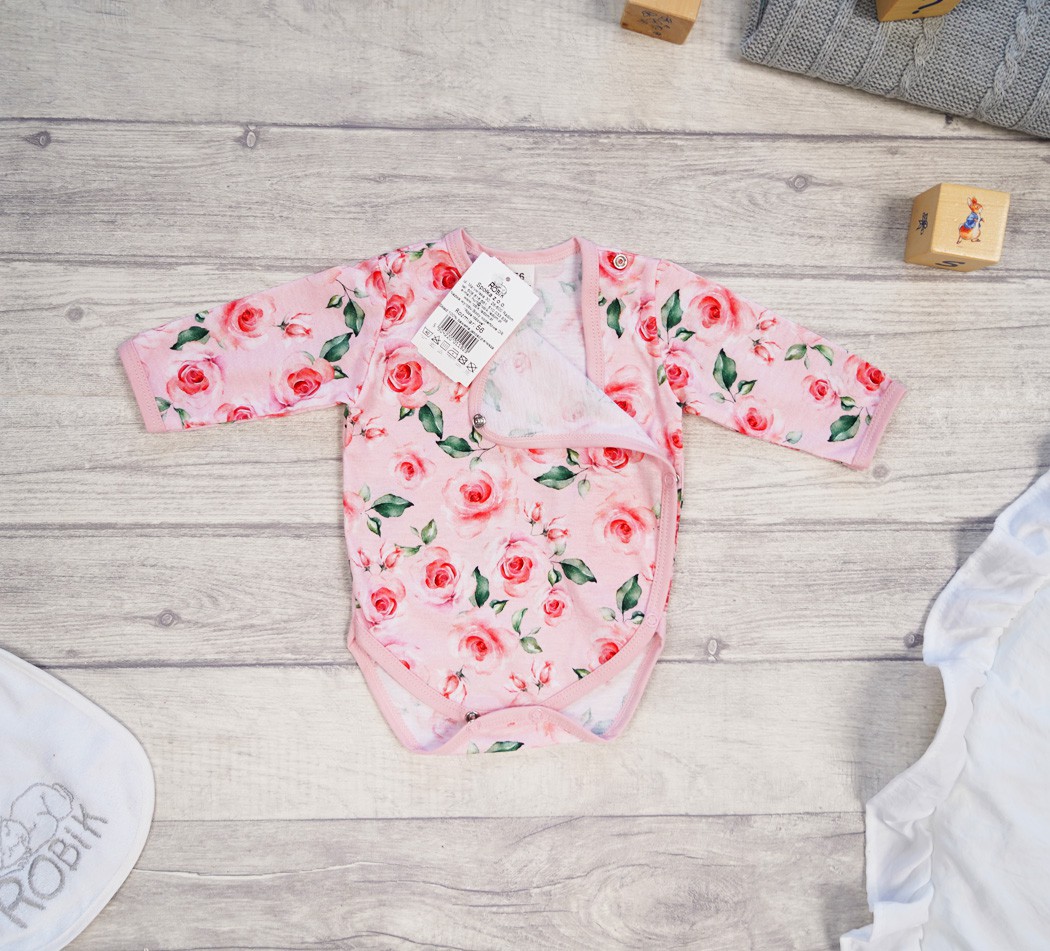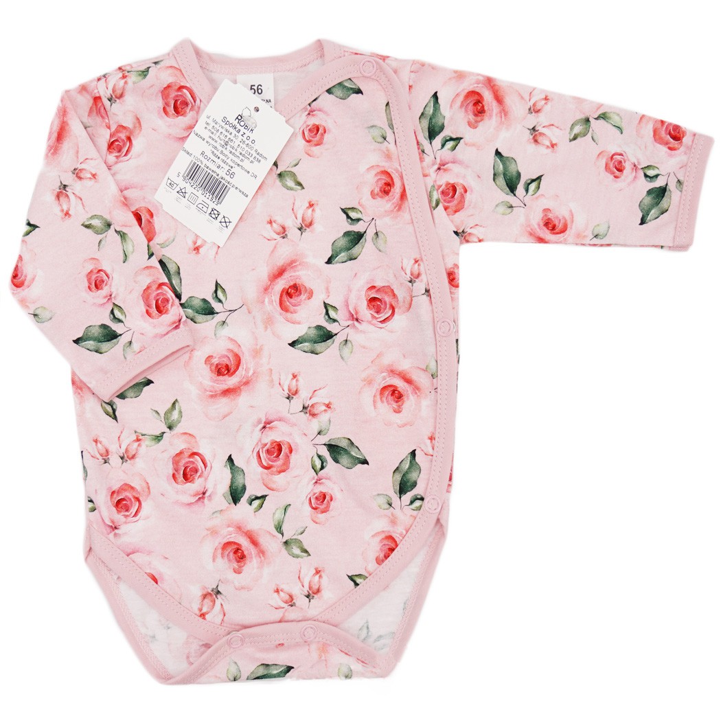 Niemowlęce body kopertowe z długim rękawem w róże na jasnoróżowym tle.