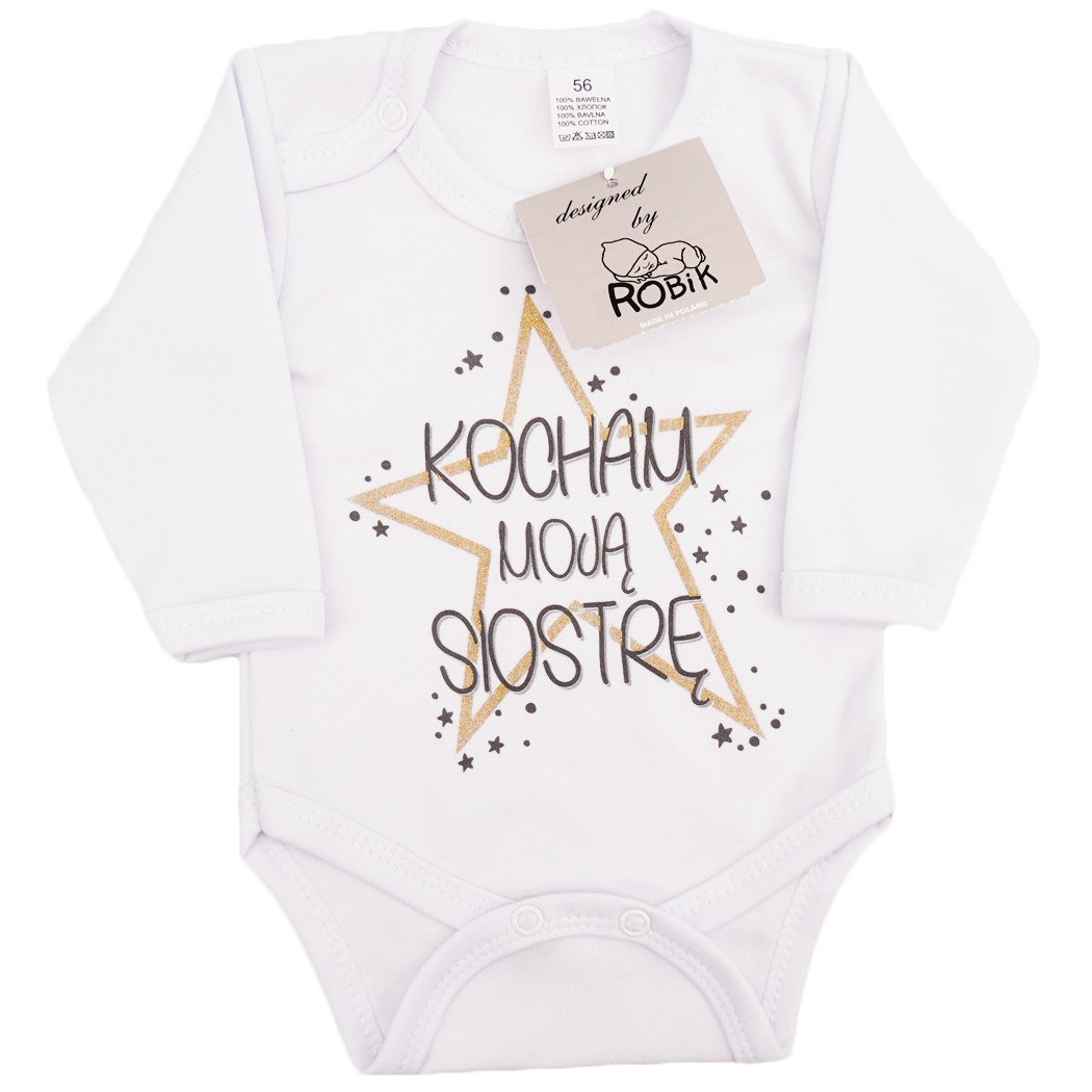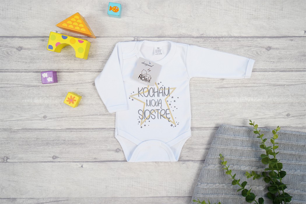 Body dziecięce białe z długim rękawem, gwiazdą i napisem: KOCHAM MOJĄ SIOSTRĘ