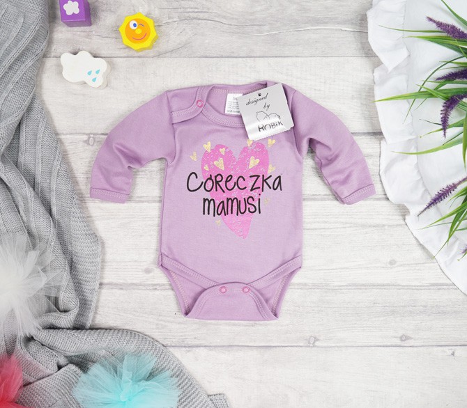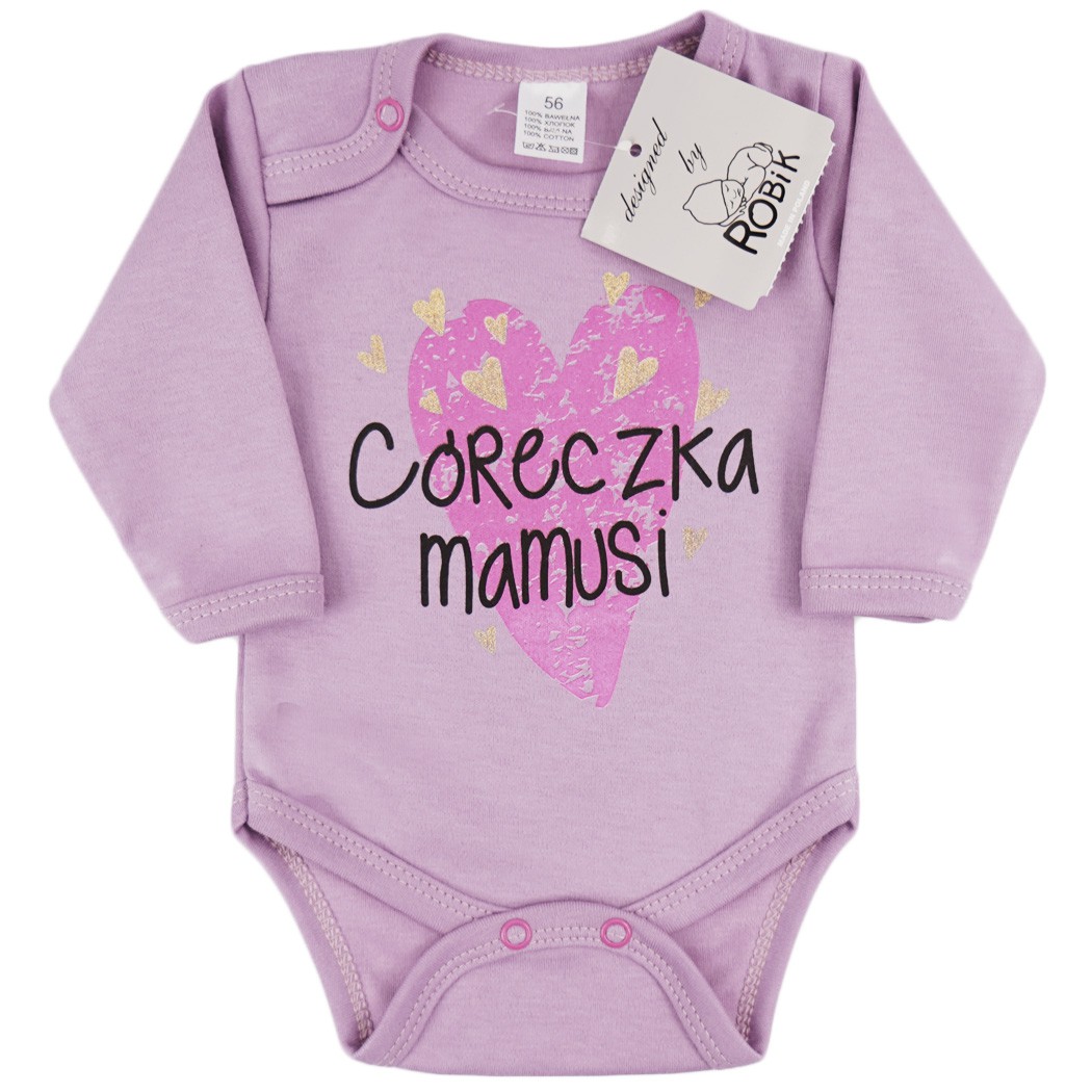 Body dziecięce wrzosowe z długim rękawem, serduszkami i napisem: CÓRECZKA MAMUSI