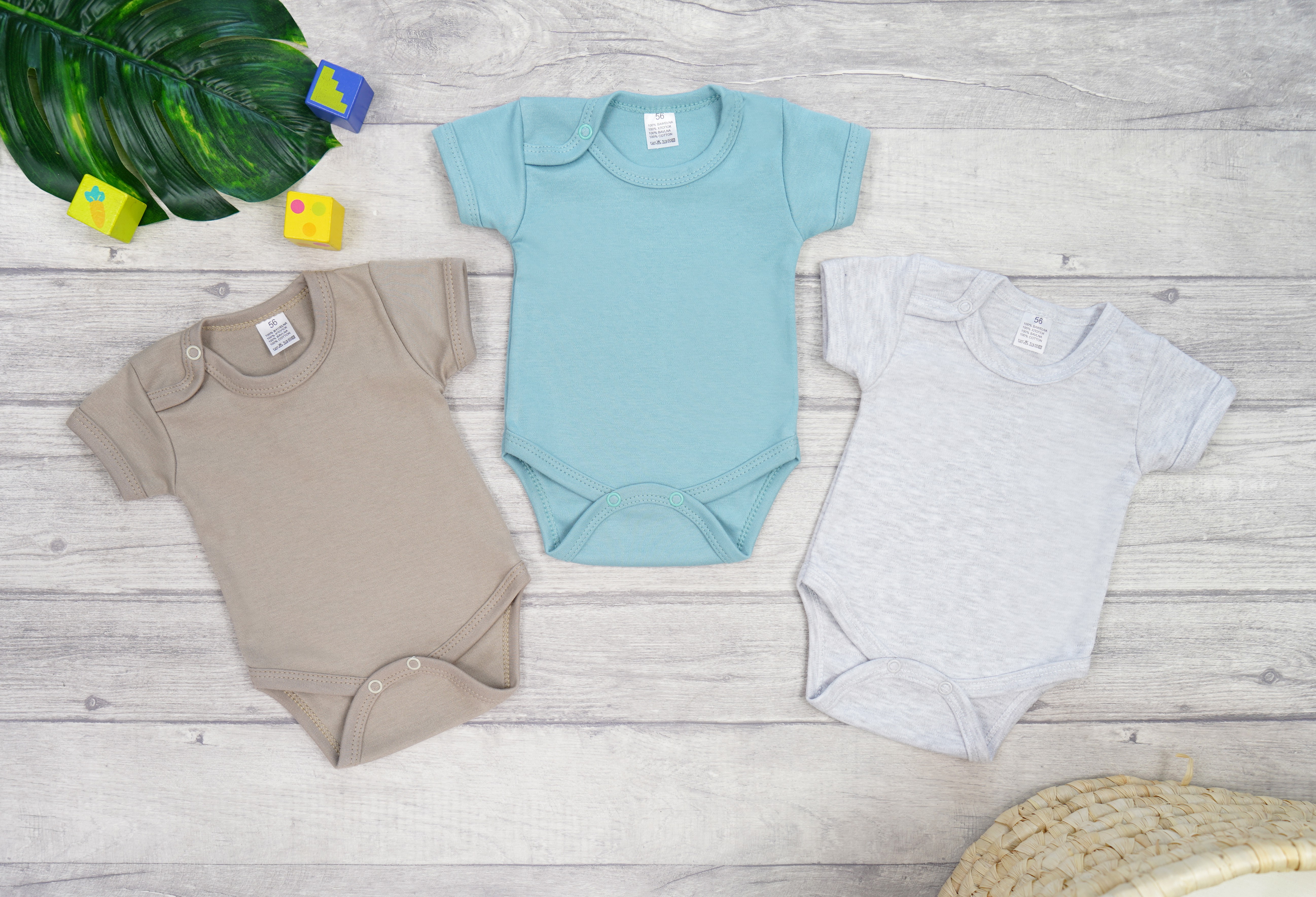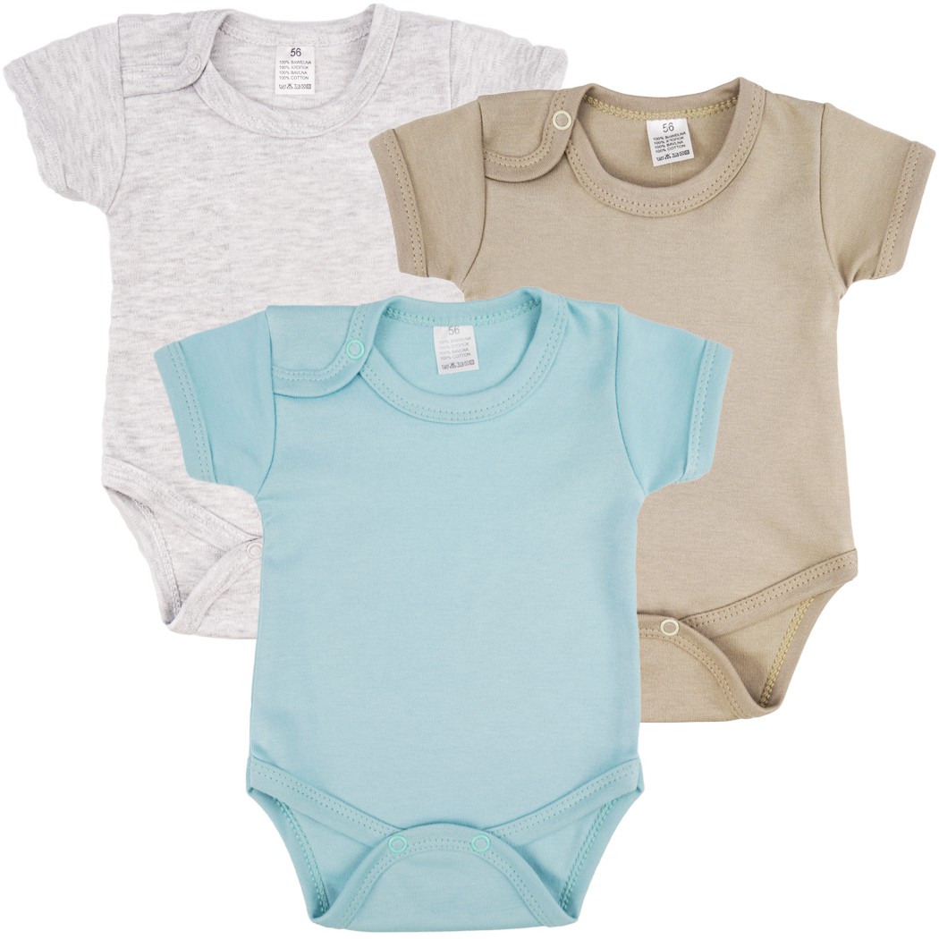 3pak praktycznych body niemowlęcych z krótkim rękawem w kolorach: iceberg, piaskowy i szary.