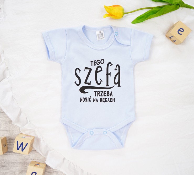 Body dziecięce z krótkim rękawem z nadrukiem: TEGO SZEFA TRZEBA NOSIĆ NA RĘKACH.