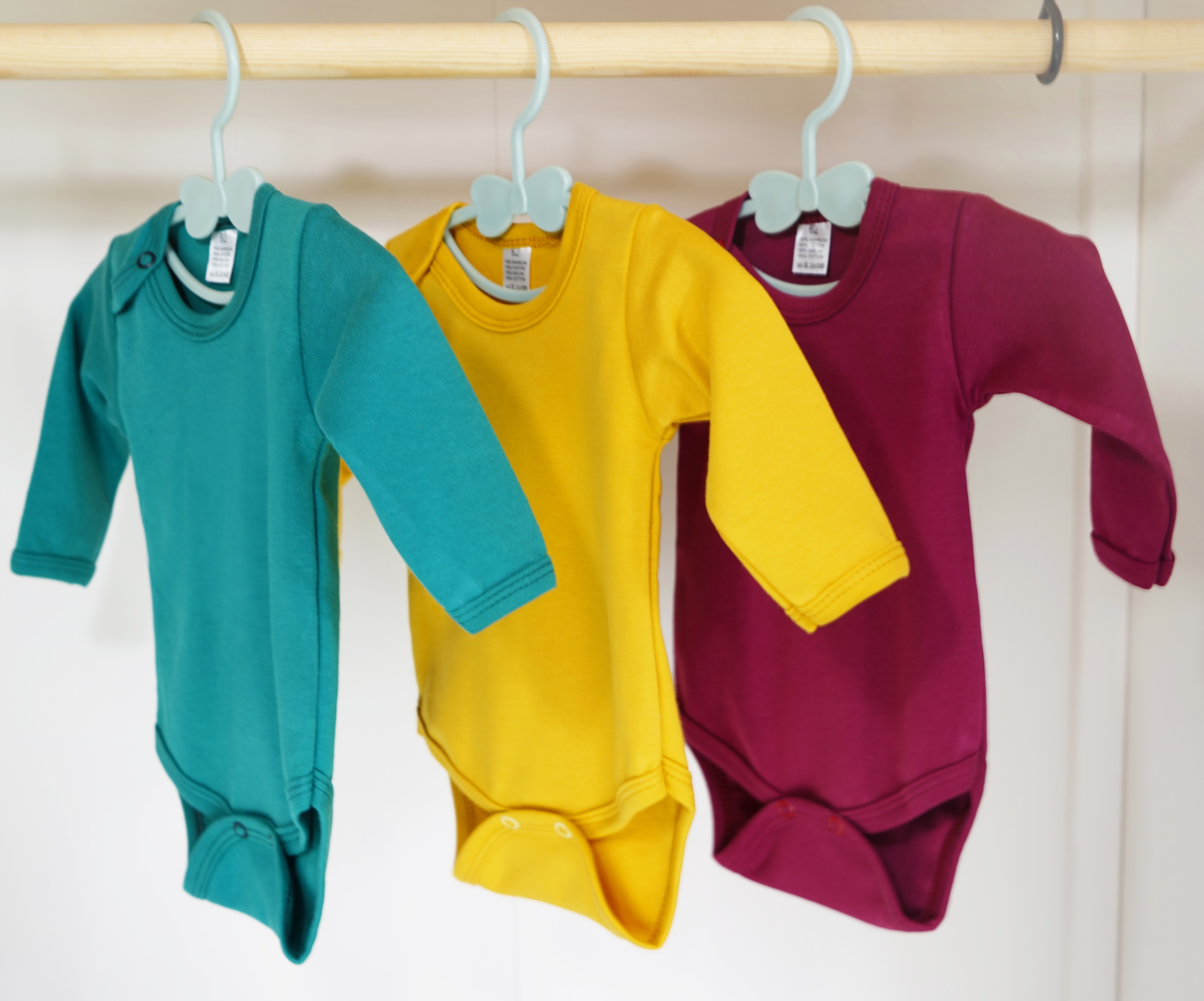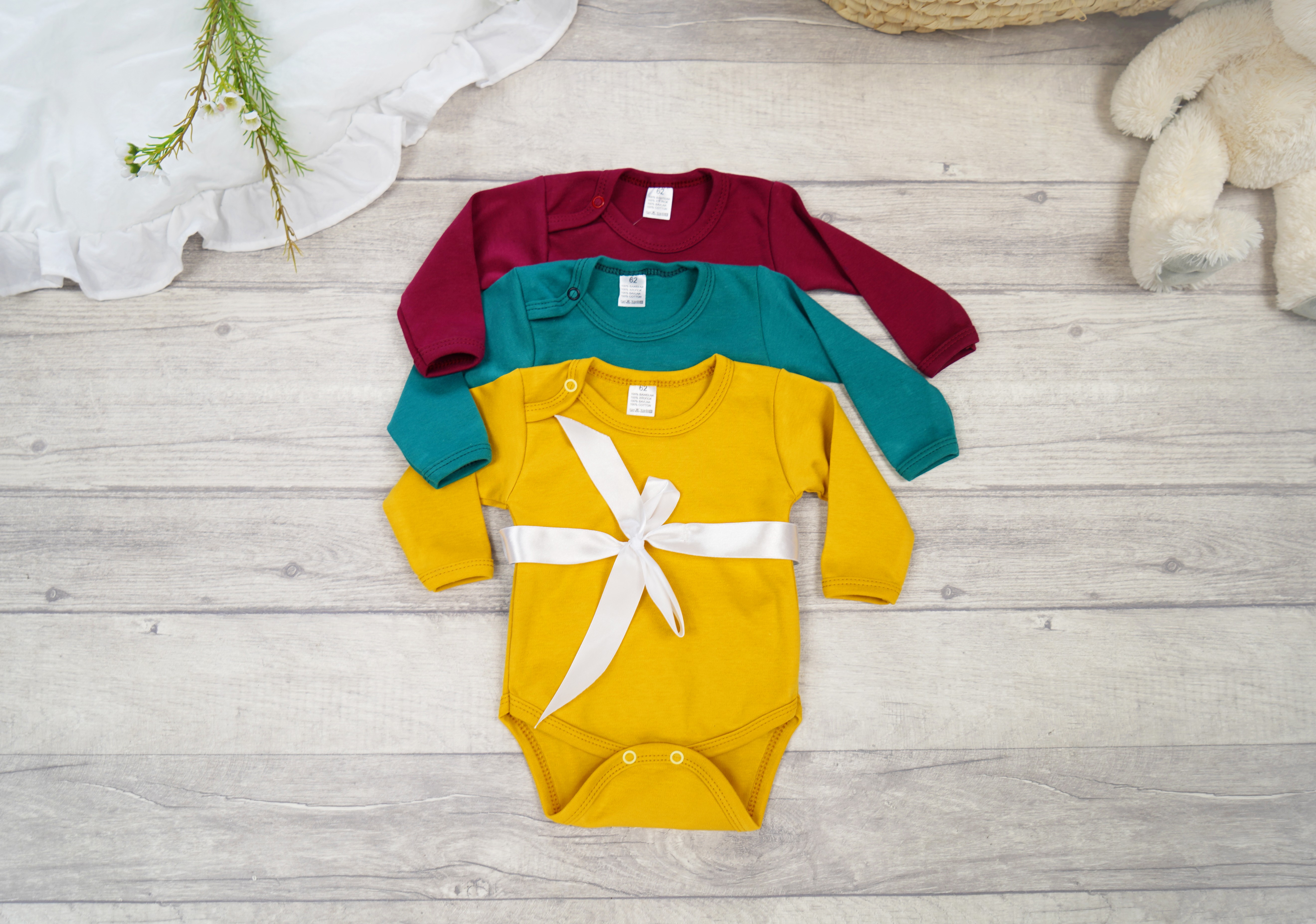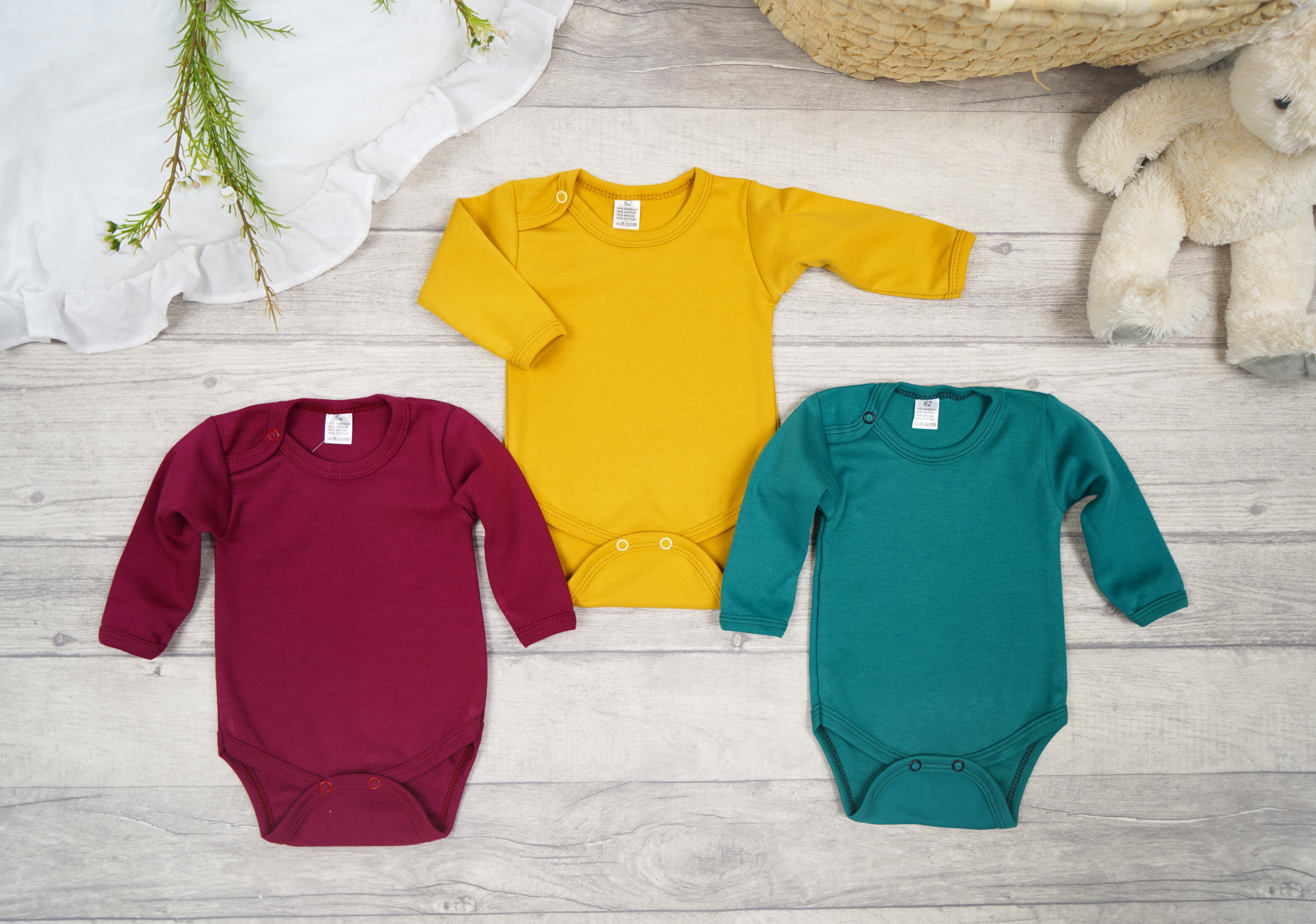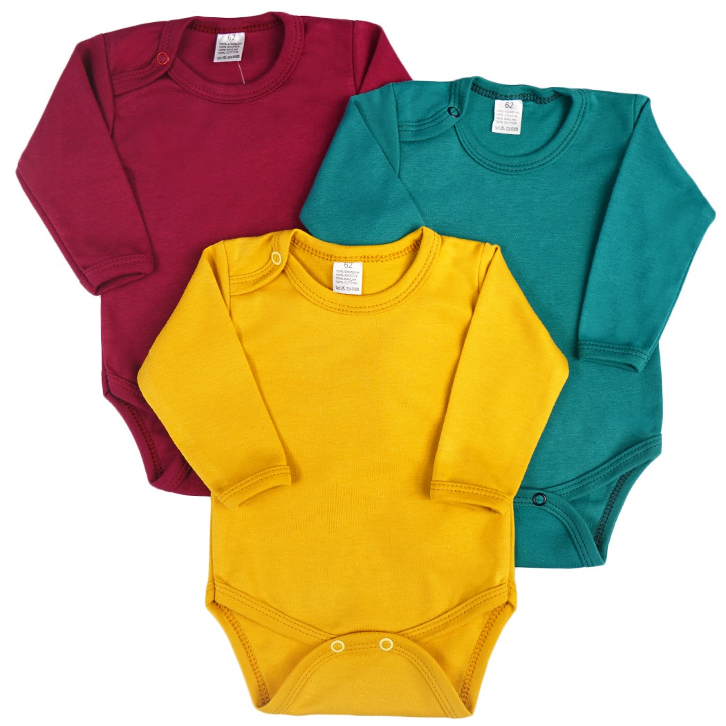 3PAK praktycznych BODY niemowlęcych z długim rękawem w kolorach: bordowy, musztardowy, butelkowy