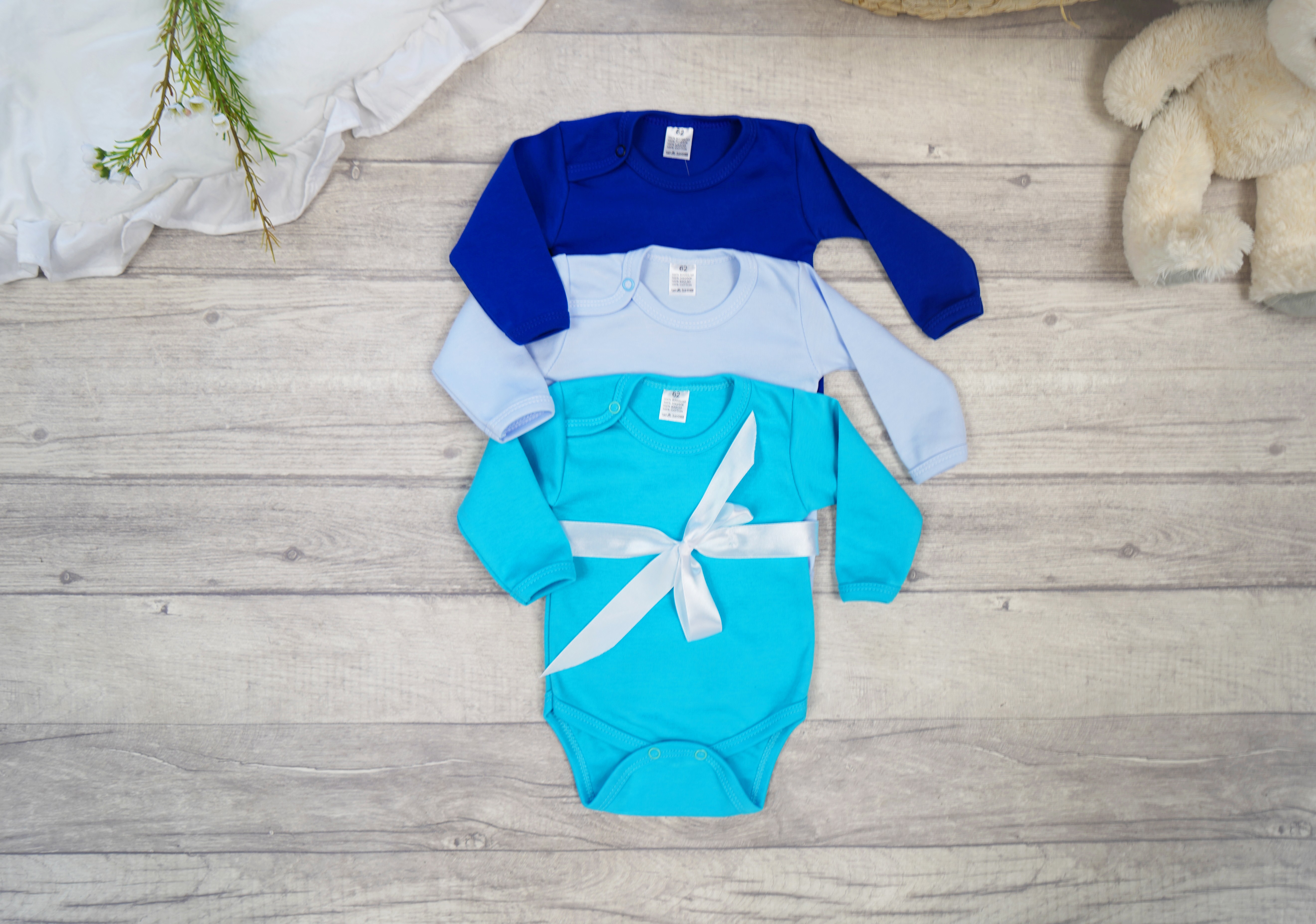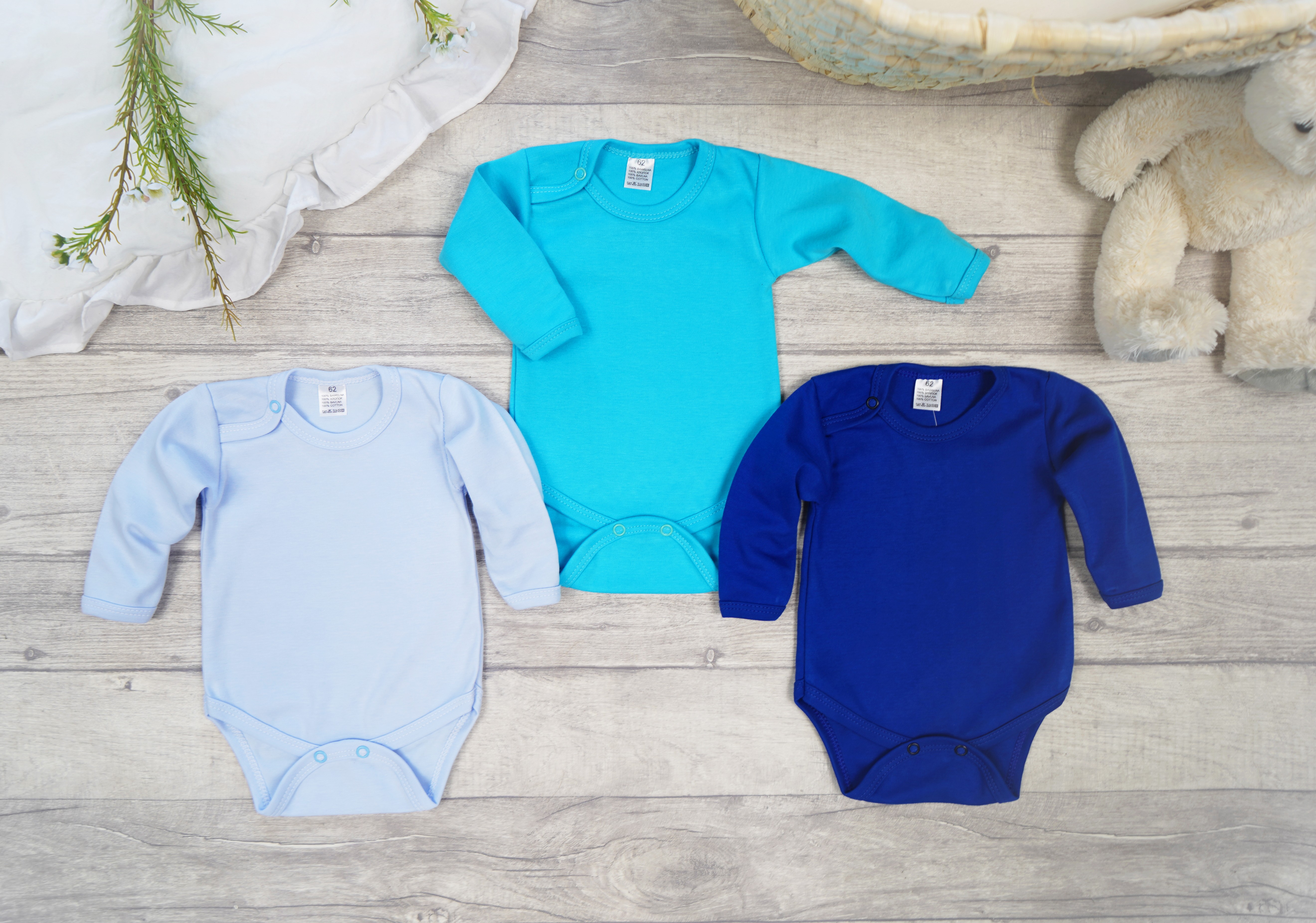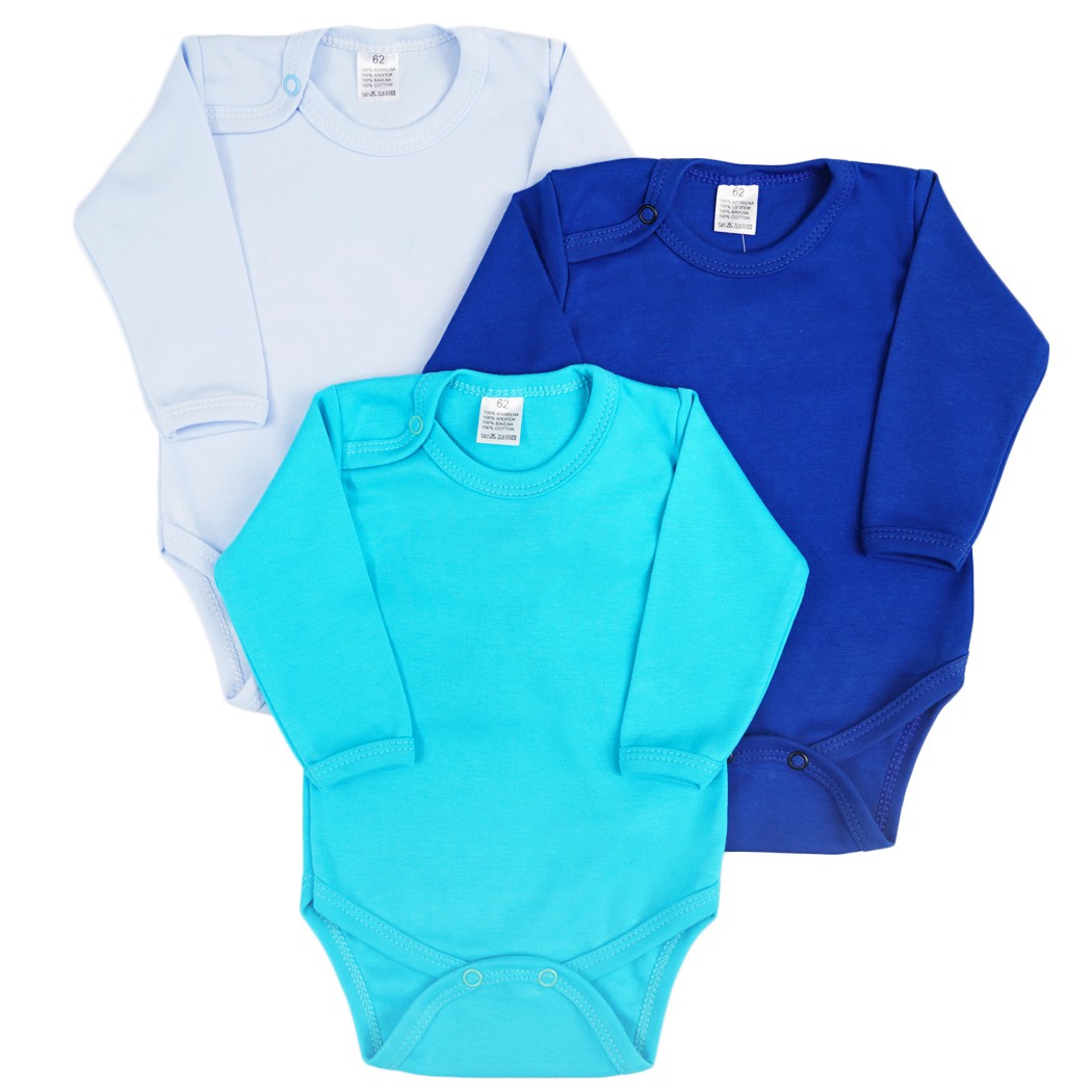 3PAK praktycznych BODY niemowlęcych z długim rękawem w kolorach: chabrowym, lazurowym i jasnym niebieskim