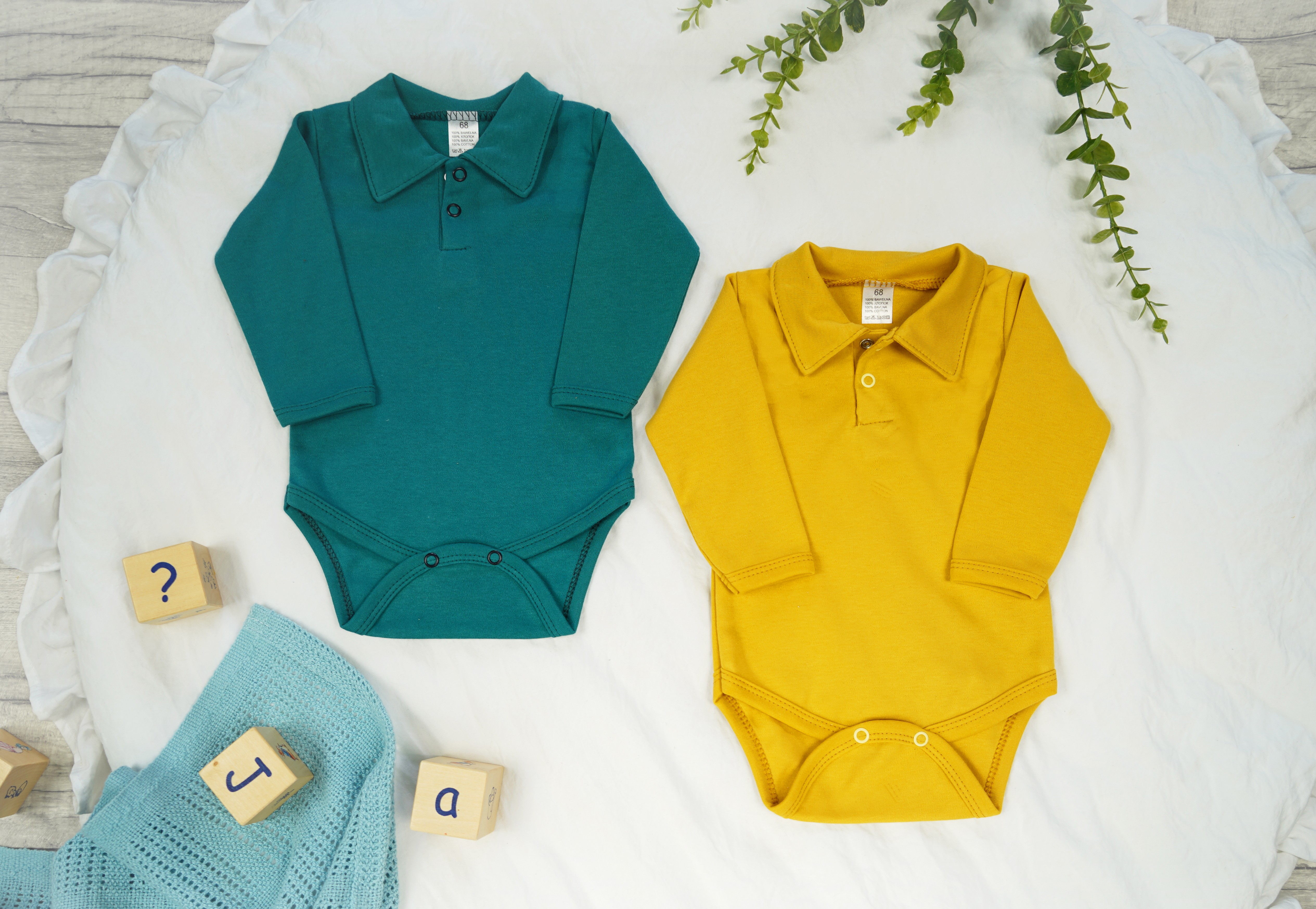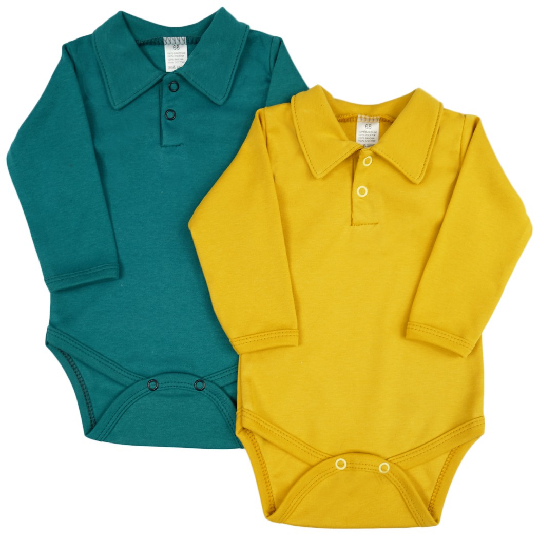 Ten dwupak zawiera musztardowe i zielone body chłopięce z długim rękawem, rozpinane pod szyją i w kroku dla łatwego wymieniania pieluszek. Body chłopięce polo sprawdzi się idealnie zarówno na co dzień jak i na specjalne okazje. Chłopięce body są wykonane z 100% gładkiej bawełny. Koszula dla chłopca wykończona pod szyją delikatnym trójkątnym kołnierzykiem i zapięciem na dwie bezniklowe napki zapewni maluszkowi odpowiednią termoregulację oraz doda elegancji chłopięcej stylizacji.