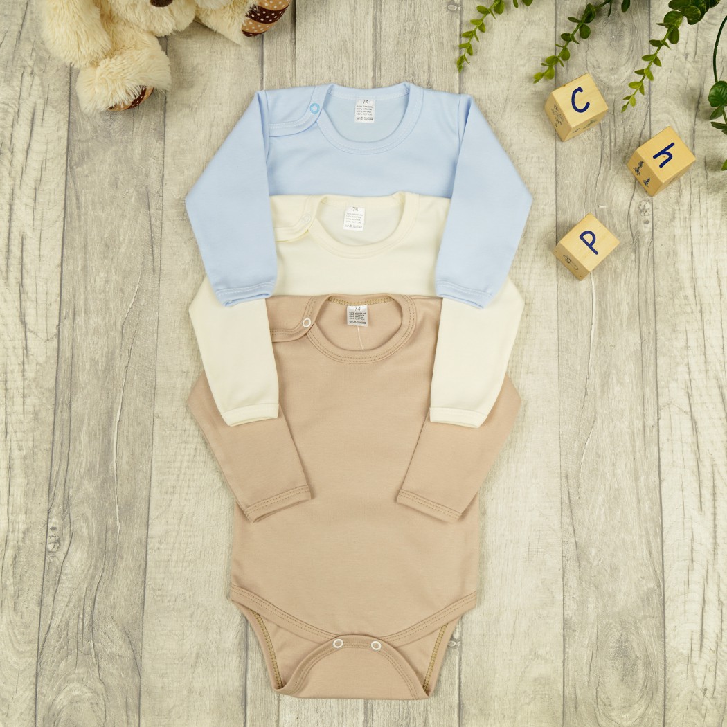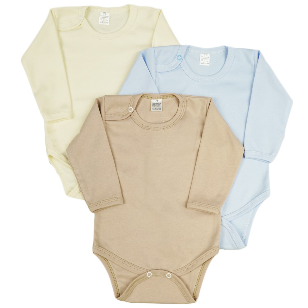 3PAK praktycznych BODY niemowlęcych z długim rękawem w kolorach: błękit, beż, ecru
