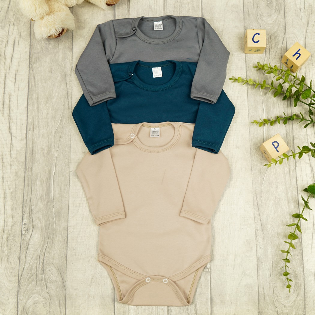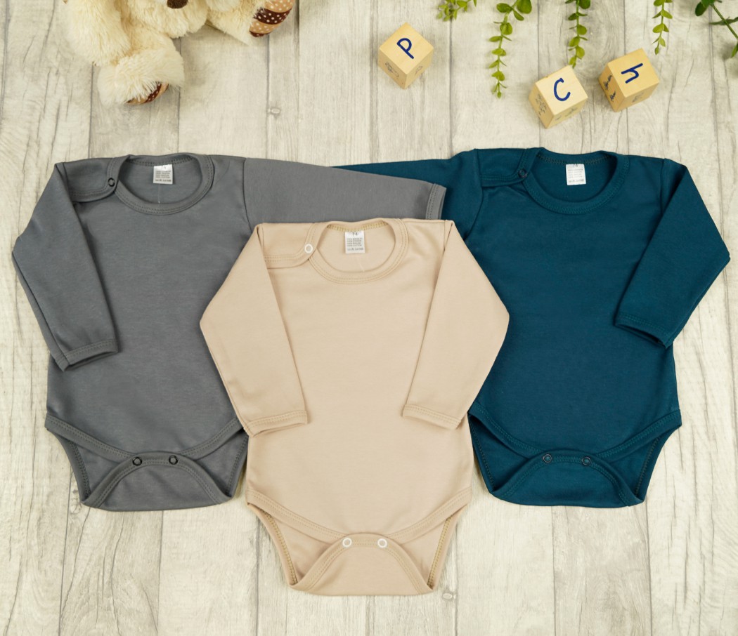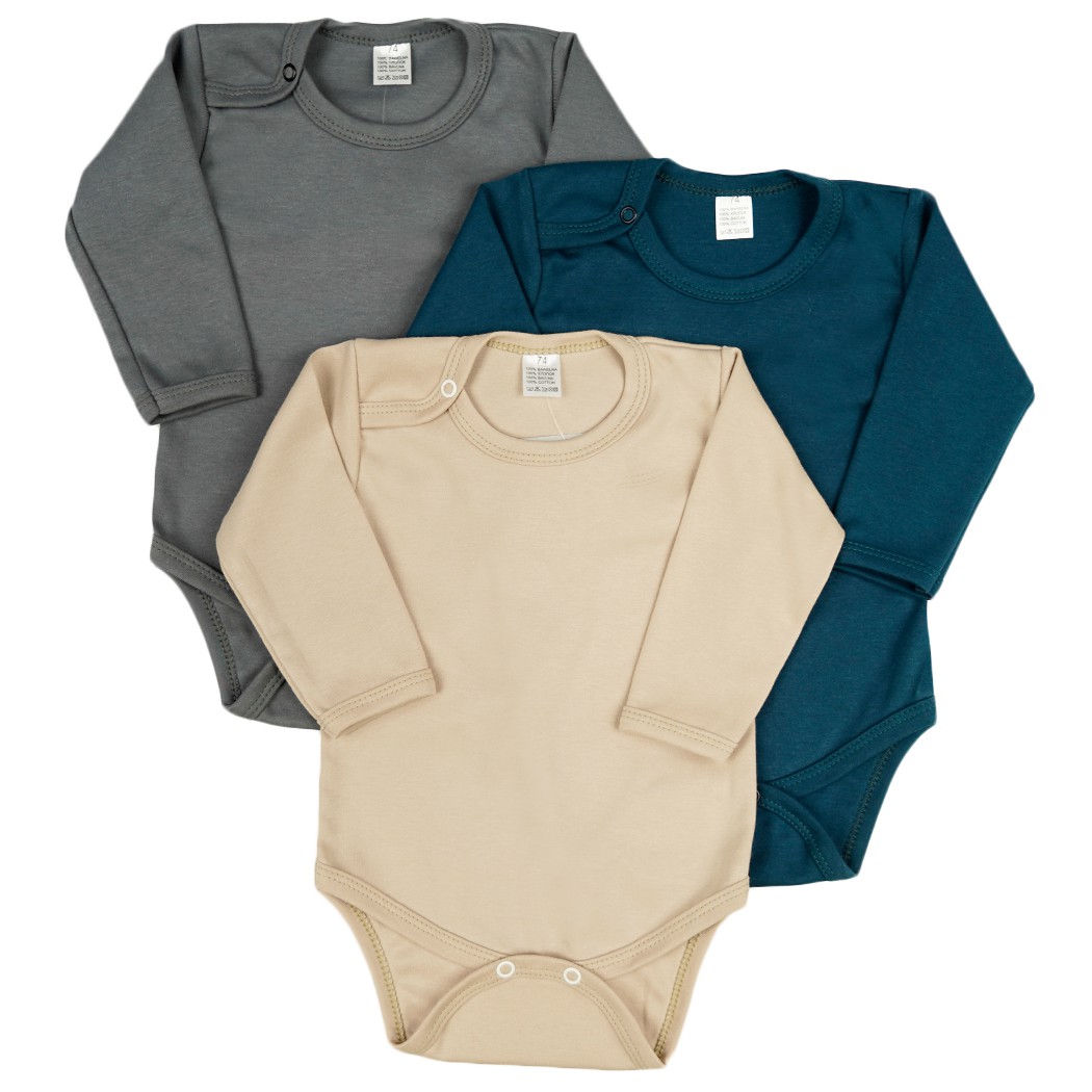3PAK praktycznych BODY niemowlęcych z długim rękawem w kolorach: petrol, grafit i beż