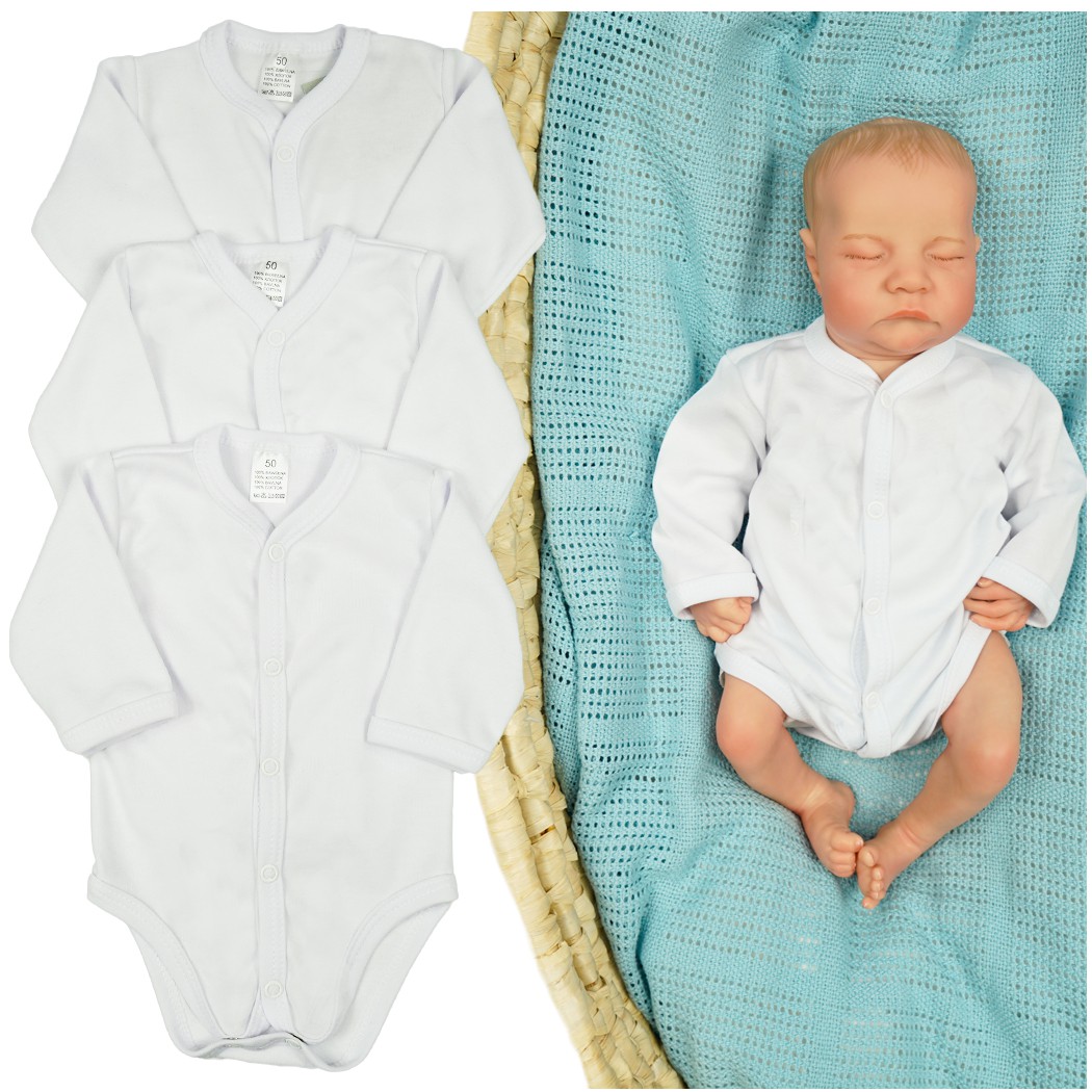 3pak niemowlęcych body rozpinanych z długim rękawem w kolorze białym.