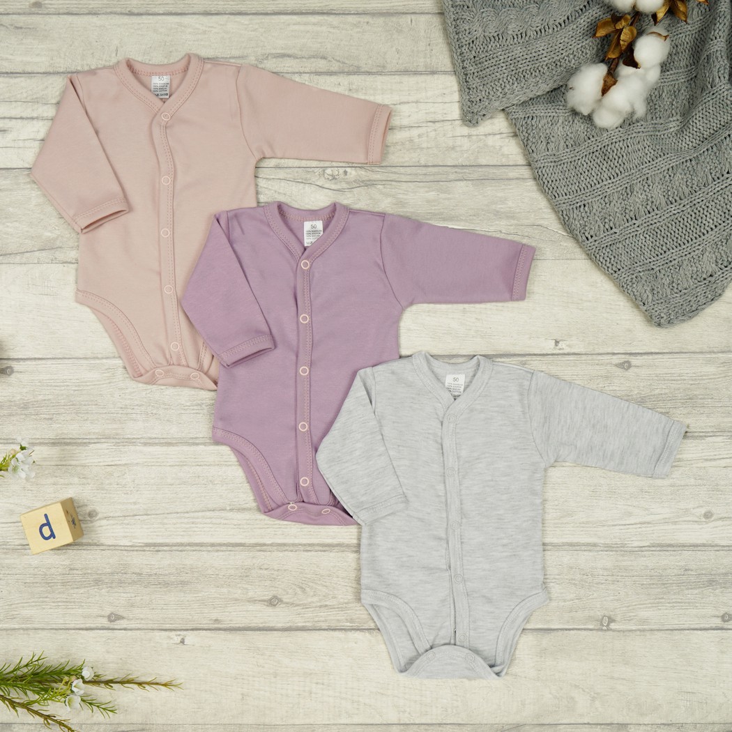 3pak niemowlęcych body rozpinanych z długim rękawem w kolorach: wrzosowym, różowym i szarym.