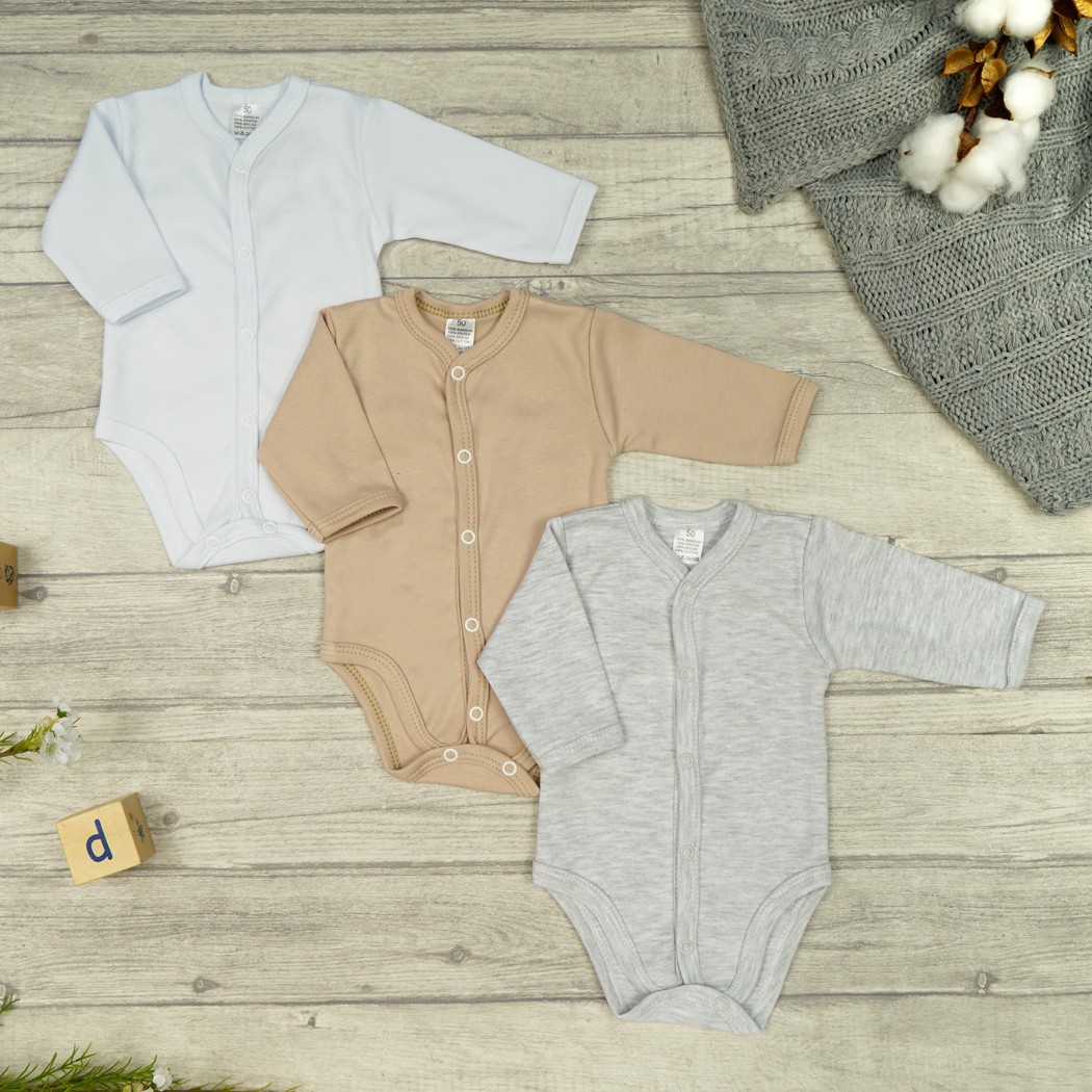 3pak niemowlęcych body rozpinanych z długim rękawem w kolorach: białym, beżowym, szarym.