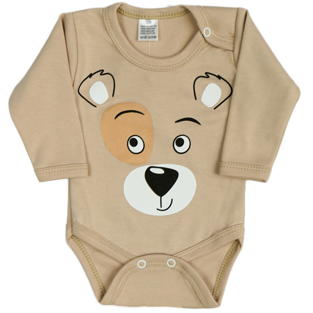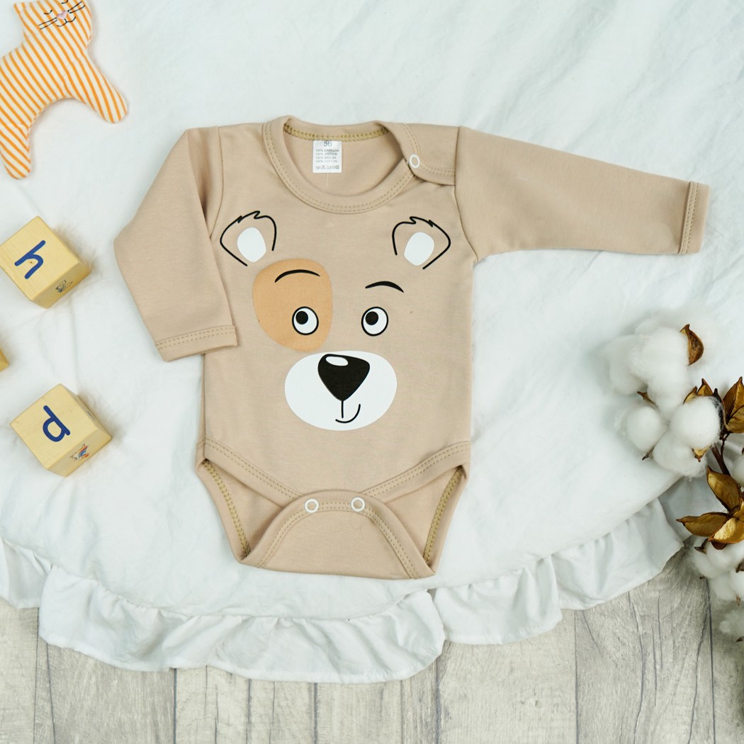 Body dziecięce w kolorze jasnym beżowym z długim rękawem i nadrukiem misia.