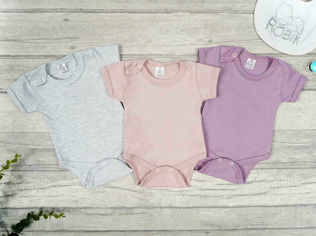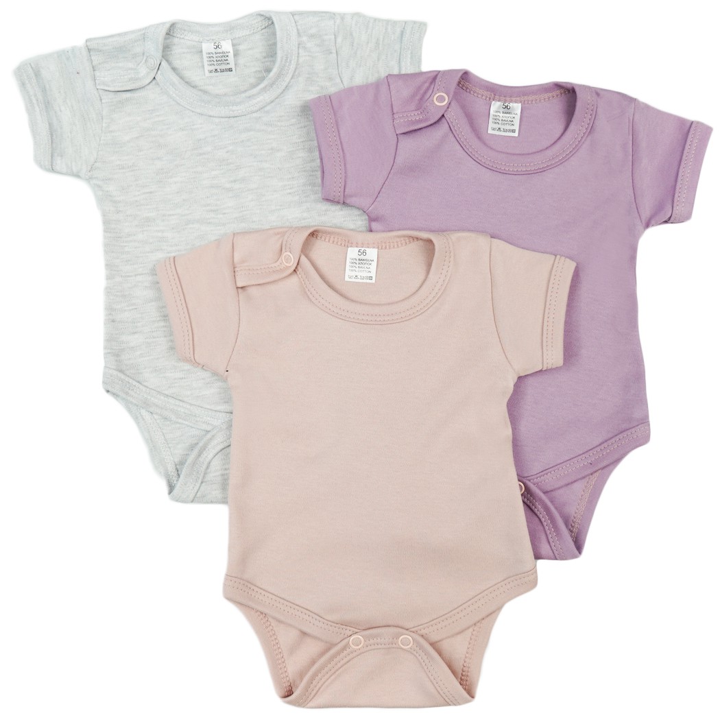 3pak praktycznych body niemowlęcych z krótkim rękawem w kolorach: szary, wrzosowy i brudny róż